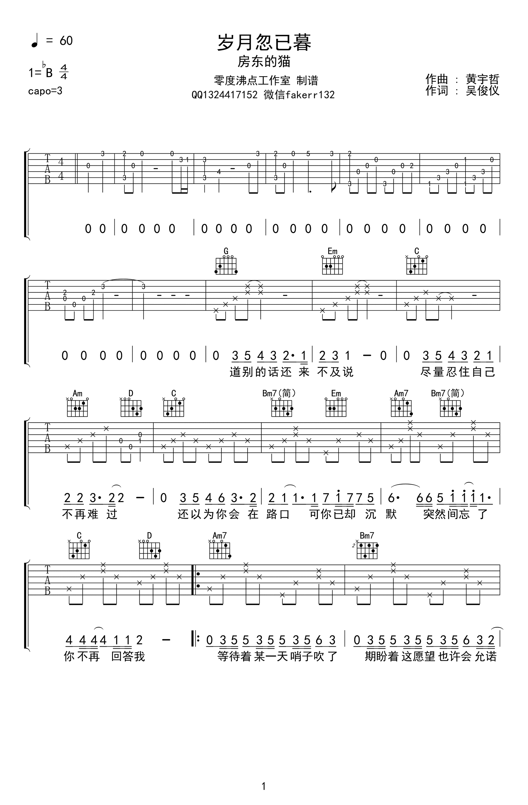 曲谱介绍: 《岁月忽已暮》,房东的猫演唱,青春爱情电影《岁月忽已暮》同名主题曲。岁月忽已暮六线谱,原调降B,CAPO夹三品,基本按照原曲感觉进行的编配。零度沸点编配出品,琴谱网网整理上传。 曲风清新温暖,沁人心脾的吟唱,自带治愈之感,愿岁月悠长,不枉少年一场,愿一场青春玩得尽兴,不负时光....