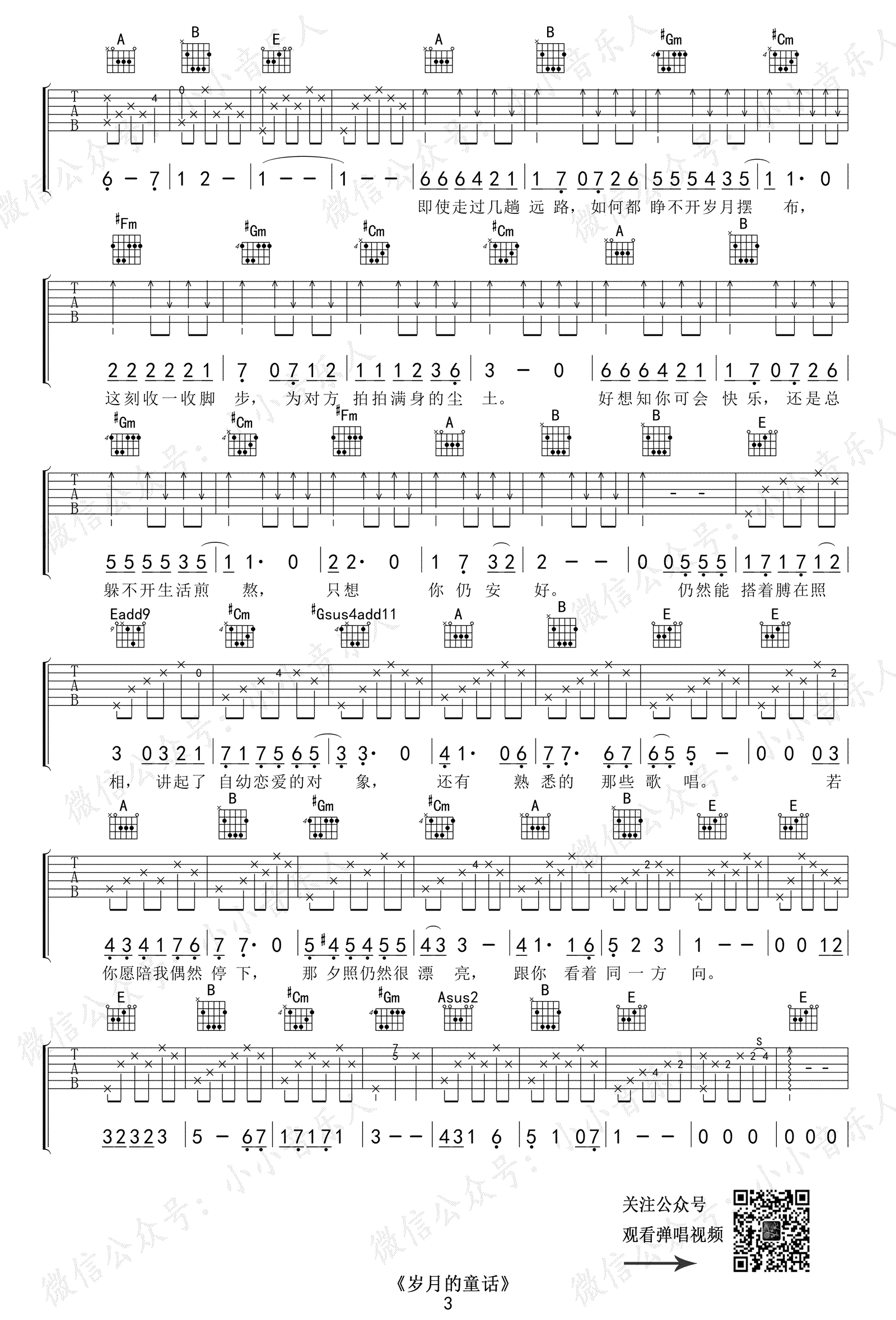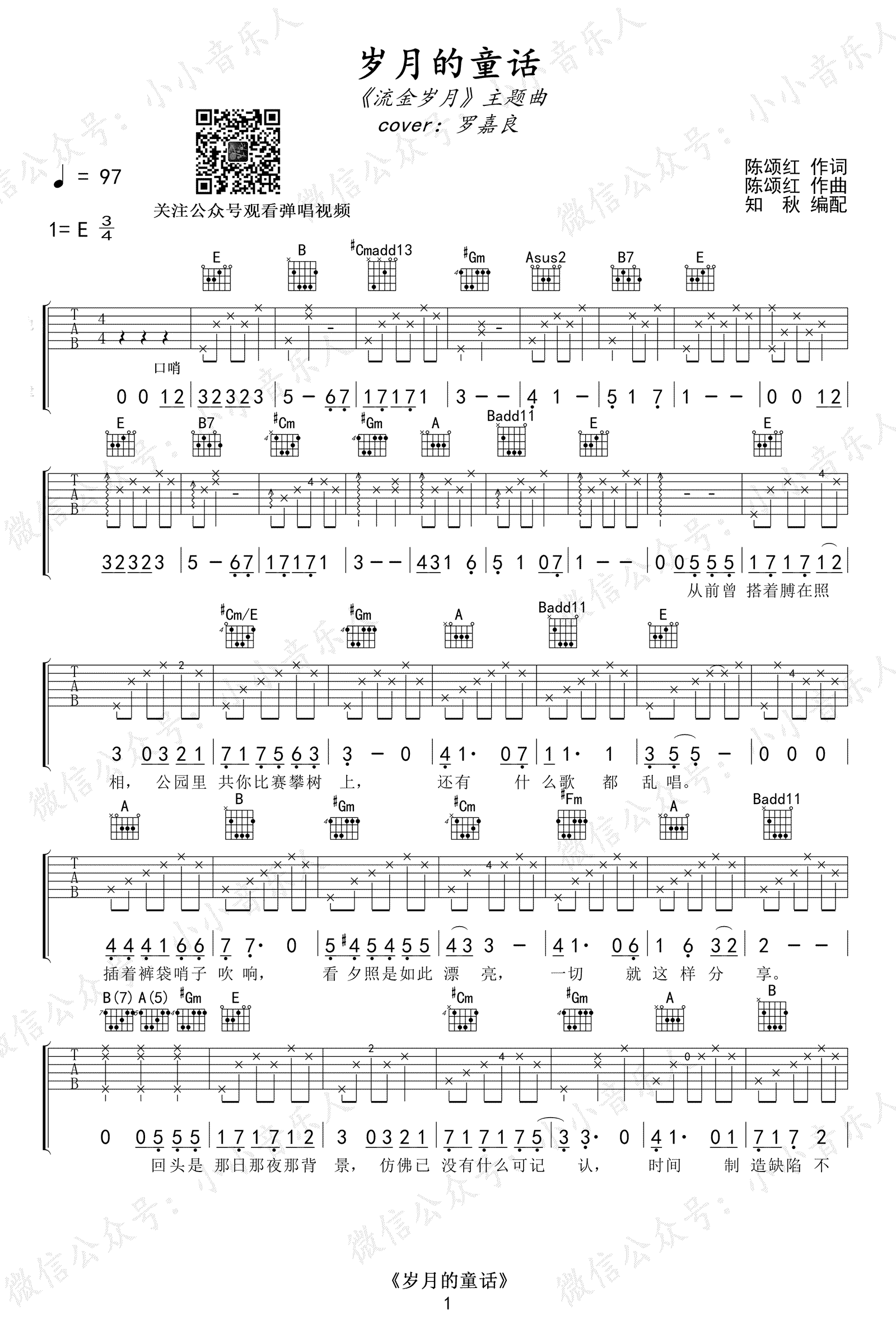 曲谱介绍: 《岁月的童话》,罗嘉良演唱,TVB电视剧《流金岁月》的主题曲,岁月的童话六线谱,三张图片谱,知秋编配出品,琴谱网网更新上传。“插着裤袋哨子吹响,看夕照是如此漂亮。”当熟悉的口哨声想起,你是否会回忆起荧屏里那一幕幕流金岁月。 和编配说明:本曲根据原版E大调编配,原曲使用多把吉他合奏,本次编配只抽取节奏吉他,部分做加花处理,间奏编成指弹形式,因为E大调多使用封闭和弦,所以间奏演奏上有难度。伴奏部分可根据自己手指实际情况安排指法,比如前奏中的第一个#Gm和弦,视频中使用开放和弦形式,但是需要手指跨4品,以保证低音的准确。