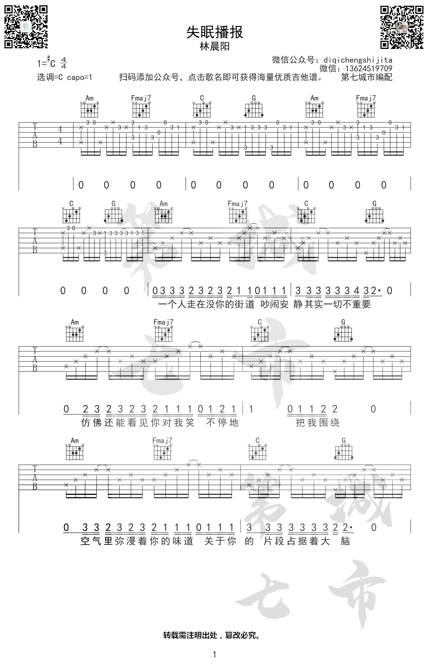 曲谱介绍: 林晨阳《失眠播报》吉他弹唱谱,共有3张高清图谱。