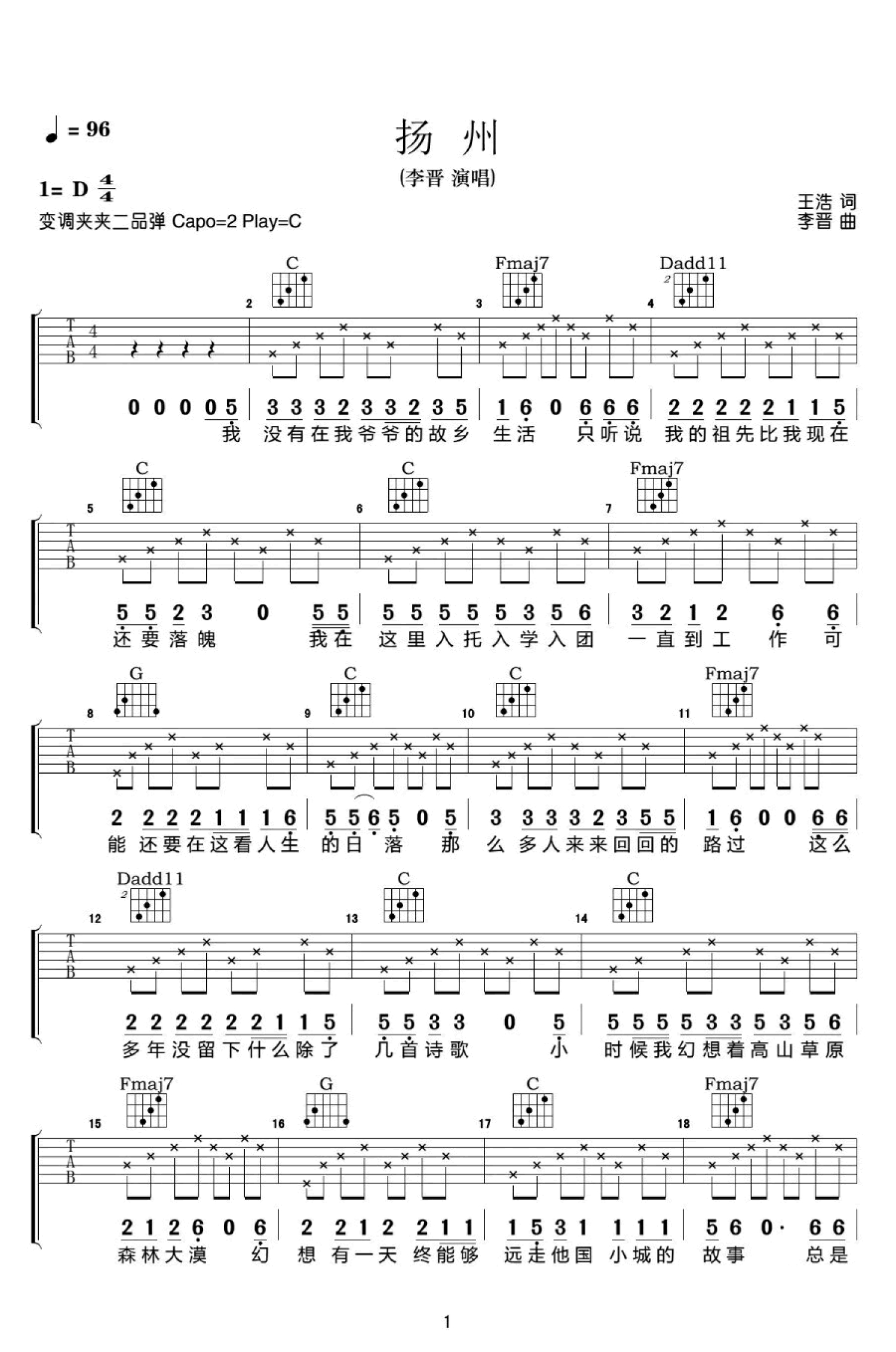 扬州吉他谱 - 李晋 - C调吉他弹唱谱