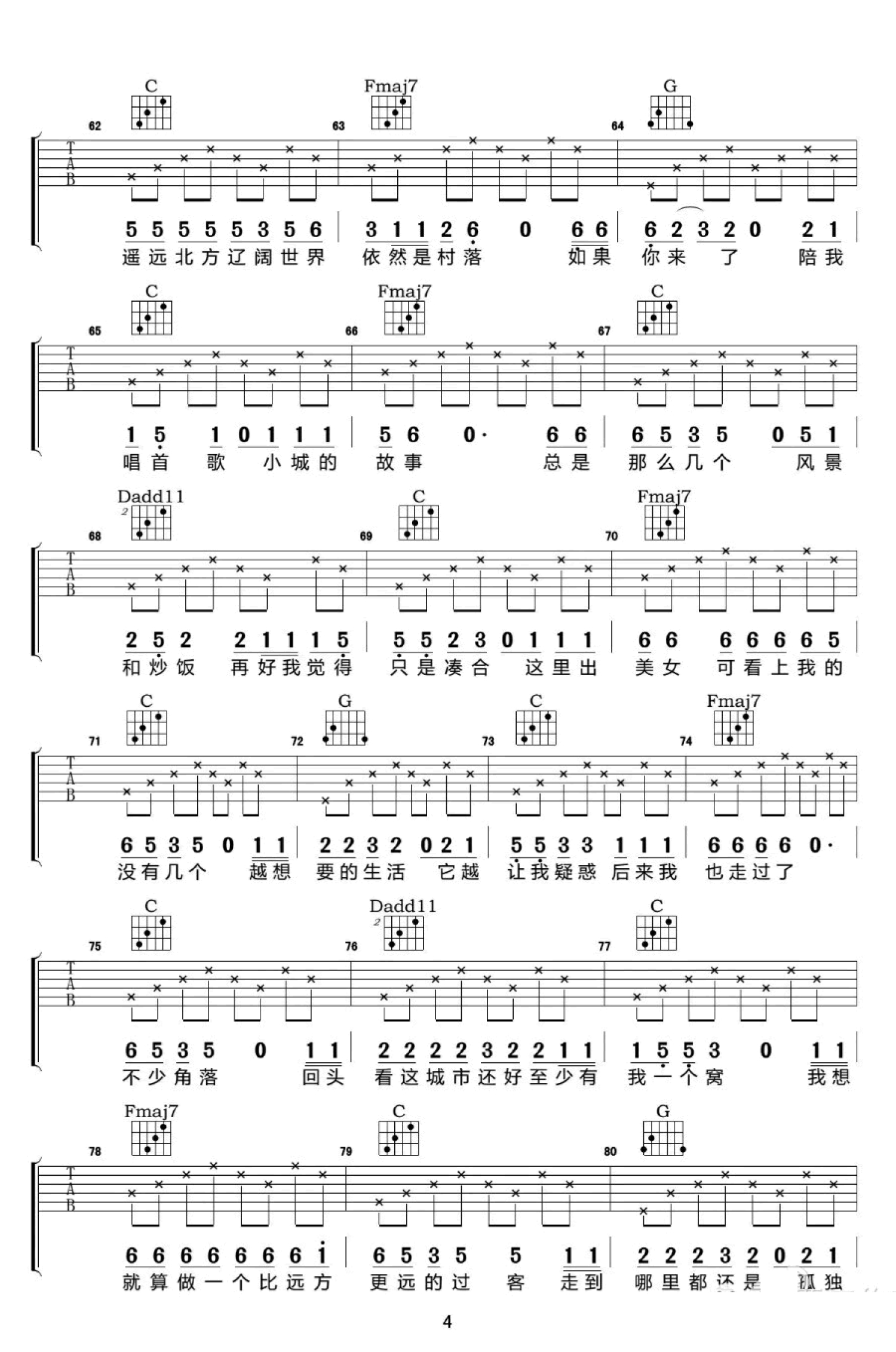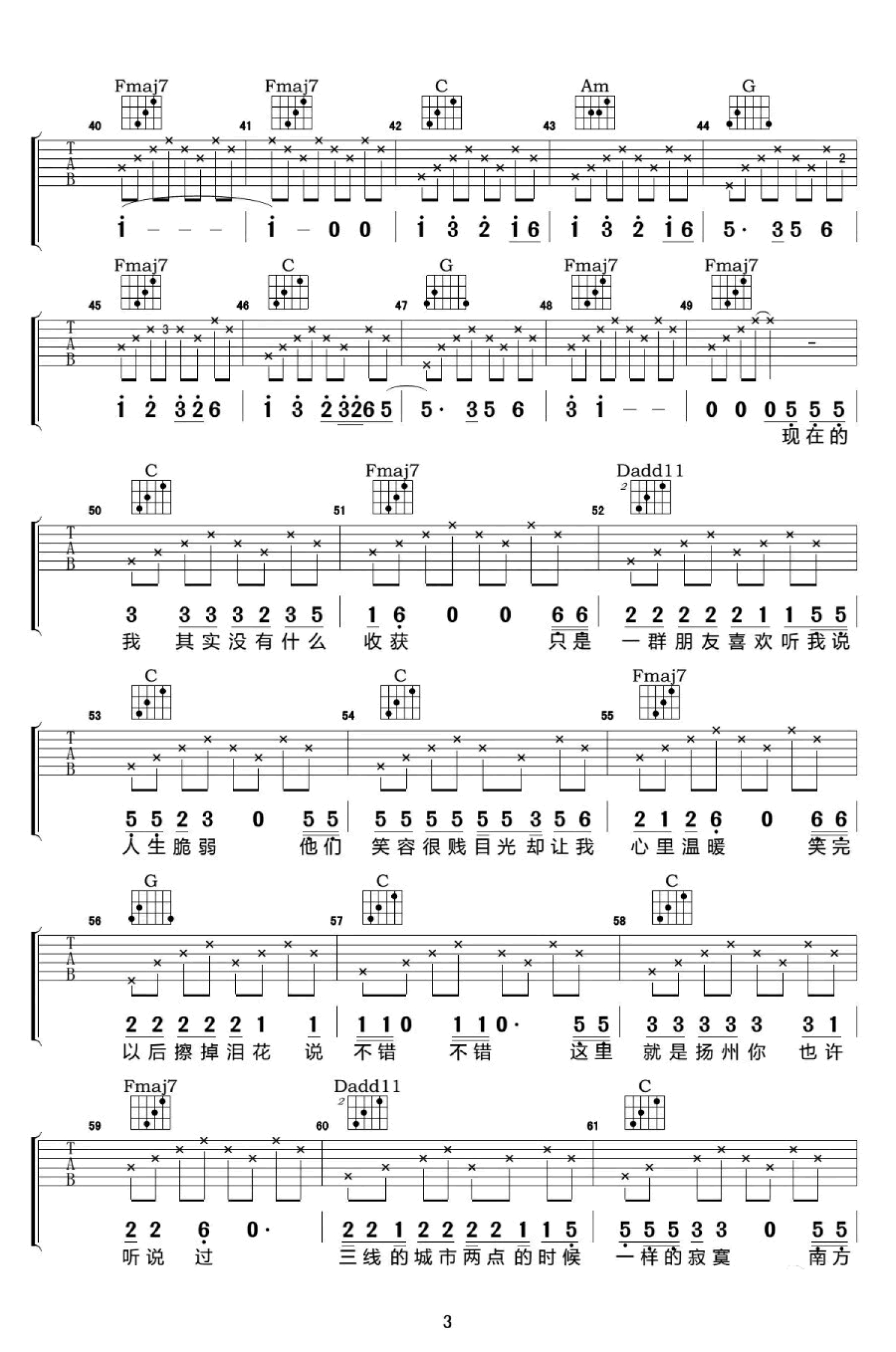 曲谱介绍: 扬州吉他谱,李晋词曲创作演唱,选用C调指法编配,CAPO2品。琴友们弹唱的时候,把这首歌改成自己的家乡,也都有一番风味。一首关于城市的民谣歌曲,属于我们每个人的“扬州”,我在这里度过了人生的小半,也将会在这里静看人生的日落。就算我去过这世间再多的角落,也只有踏着它身上的灰尘与落叶,才能让我感觉到别人无法给予的心安与温暖。