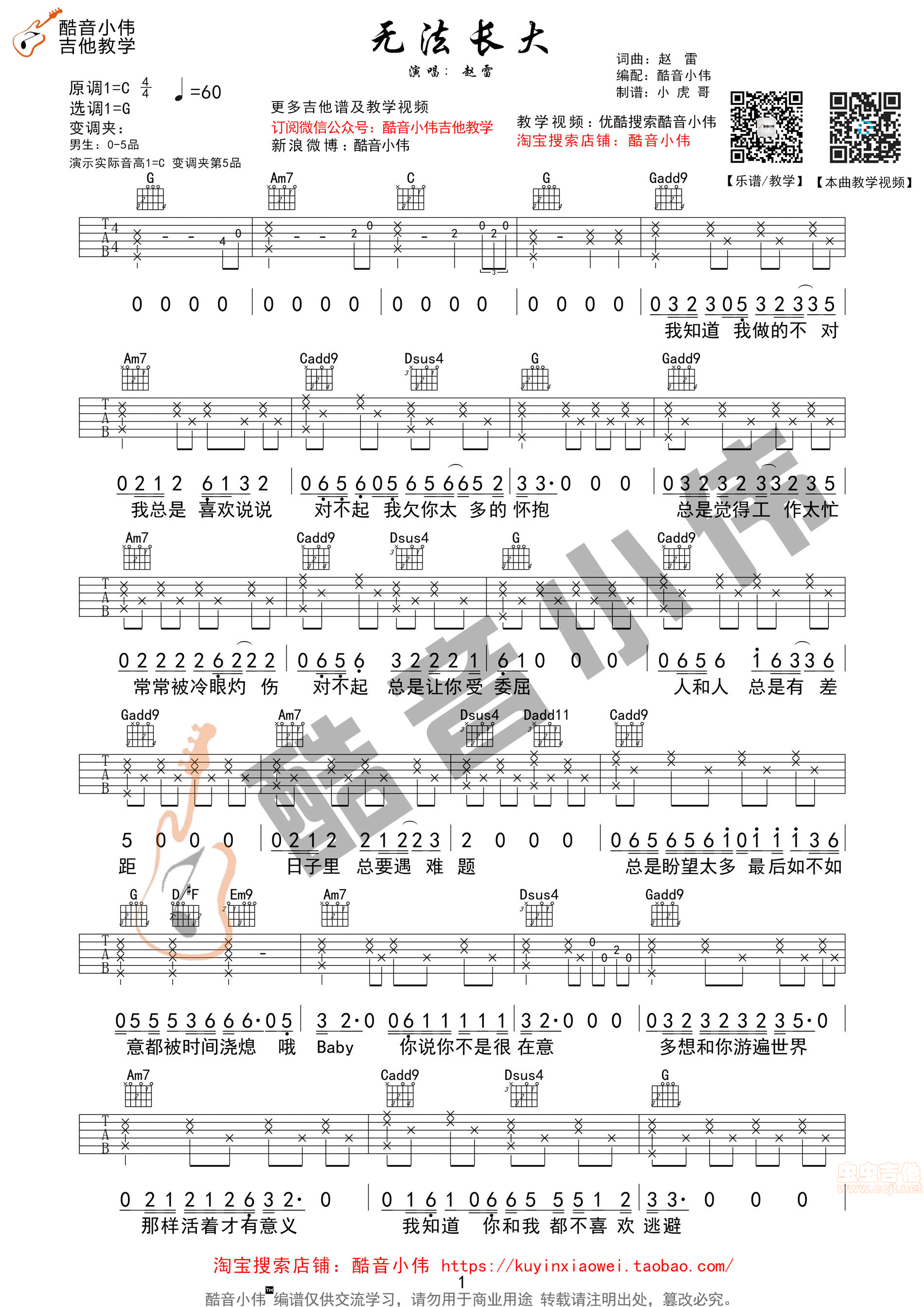 曲谱介绍: 《无法长大赵雷C调简单版原版(酷音小伟吉他教学)》吉他弹唱谱,采用C调指法编配原版,共有3张高清图谱。