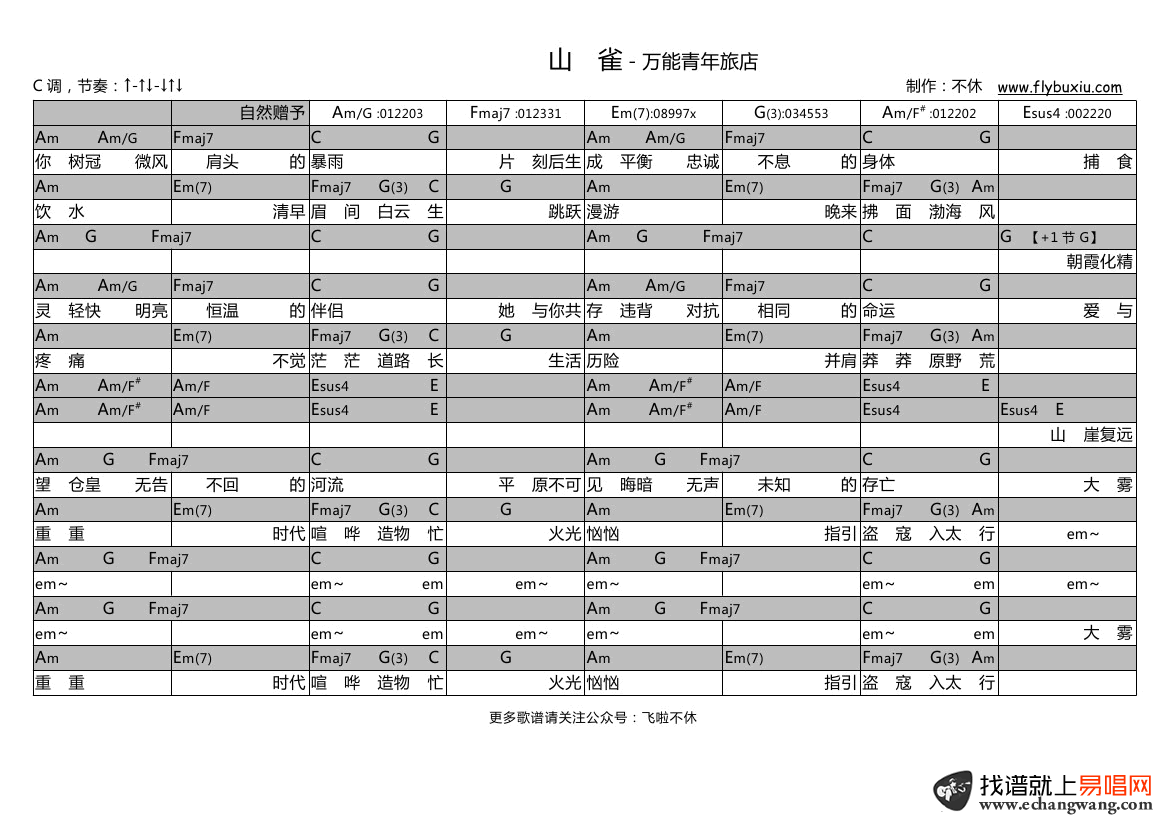 曲谱介绍: 万能青年旅店《山雀》吉他弹唱谱,共有1张高清图谱,免翻页排版设计。