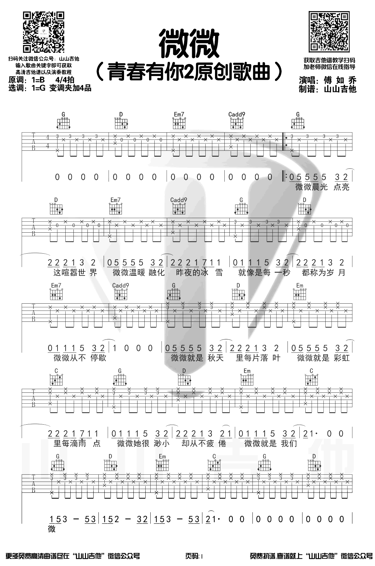曲谱介绍: 《微微》,傅如乔演唱,综艺节目《青春有你2》原创歌曲。微微六线谱,原调G选调G,变调夹夹四品,共三张弹唱图片谱。山山吉他制谱,琴谱网网整理上传。 一首温暖而又触动人心的歌曲,简单悦耳的旋律,真挚哲思的歌词,充满着乐观积极的力量。微微是一种很渺小的存在,无论面前的困难再大也从来不曾放弃,它会在多次的迷茫跌倒后择继续勇敢地向前闯。