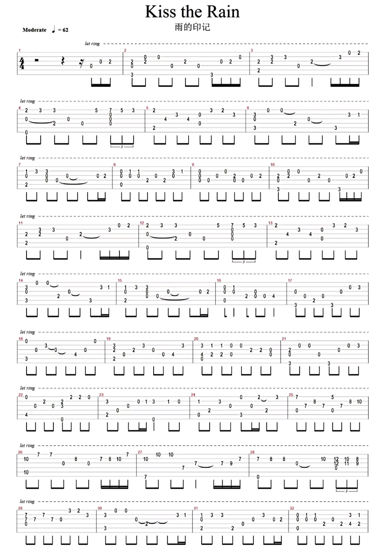 曲谱介绍: KissTheRain吉他谱指弹版,李闰珉(yiruma)的一首经典钢琴曲改编,优美而略显伤感,温暖而柔情四溢。KissTheRain雨的印记指弹吉他独奏谱,韩国钢琴演奏家李闰珉的音乐作品,将东方的抒情与西方的典雅合二为一,完美呈现出纯净与清新的个人特色。