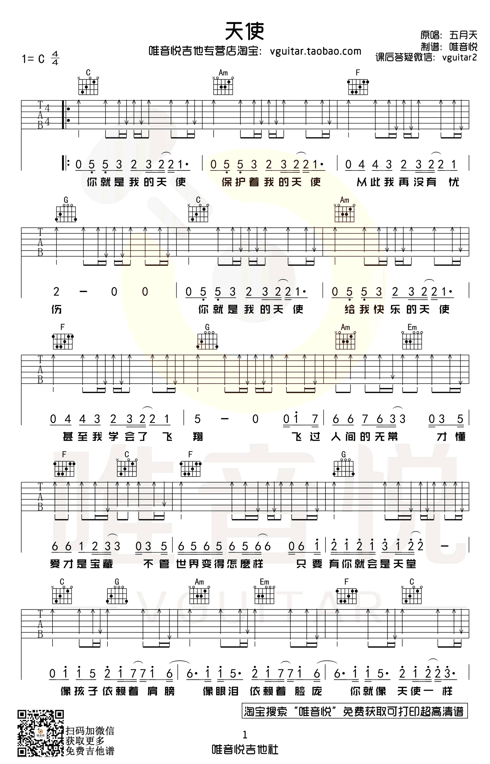 曲谱介绍: 天使,五月天演唱的一首经典歌曲,怪兽与阿信创作,天使六线谱,C调和弦编配,两张高清弹唱谱。唯音悦编配出品,琴谱网网更新上传。 纯净温暖的歌声,唱出爱和重生的希望,愿我们在这无常的世间,依然感受到靠近彼此,微笑欢聚的快乐,始终相信生活的美好。