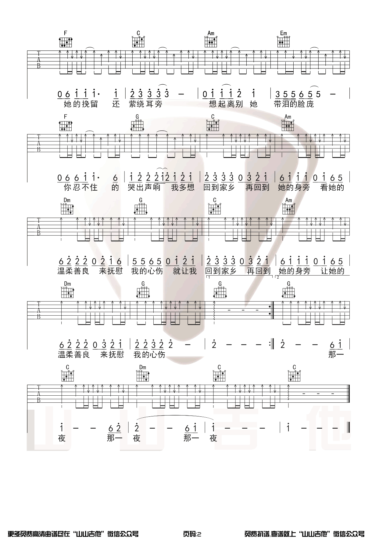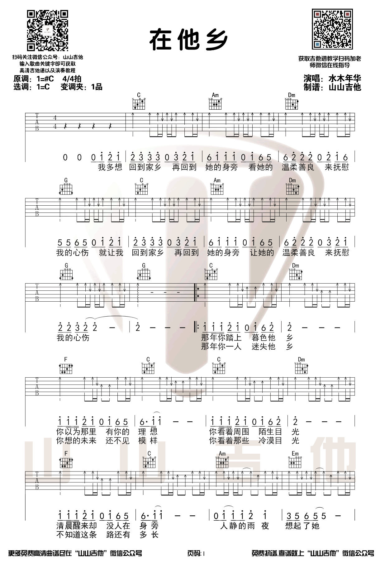 曲谱介绍: 水木年华《在他乡》,选用C调和弦指法编配,变调夹夹一品。在律动上还原了原曲的情感变化,整体比较简单,适合新手练习弹唱。山山吉他编配,琴谱网网更新上传。 一首校园民谣,一份青葱回忆,唱述学子心中对于家乡的思念,让人重温那段青春时光。随谱附上《在他乡》视频,同学们跟随老师演示练习起来吧。