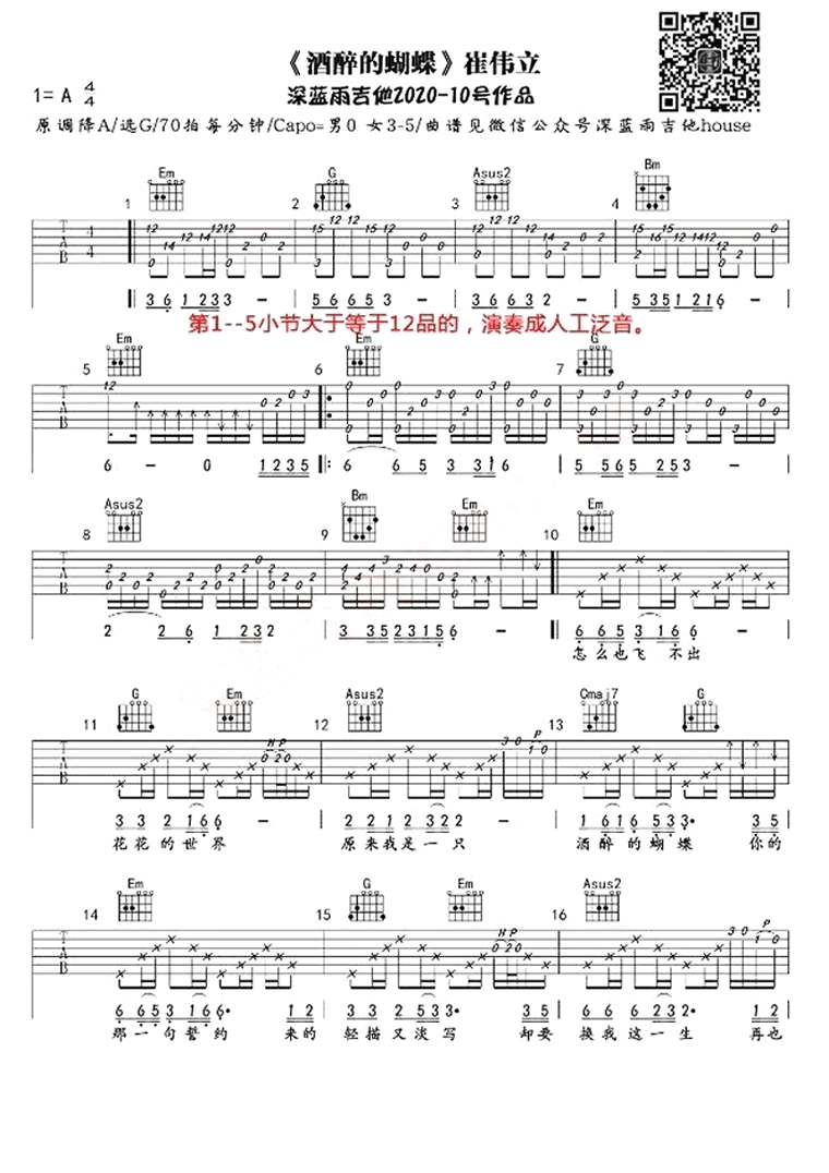 曲谱介绍: 《酒醉的蝴蝶》,崔伟立演唱,一首网络热门歌曲。酒醉的蝴蝶六线谱,原调降A选调G,每分钟70拍,变调夹女生3-5品。深蓝雨吉他编配出品,并附上弹唱示范演示,琴谱网网更新上传。