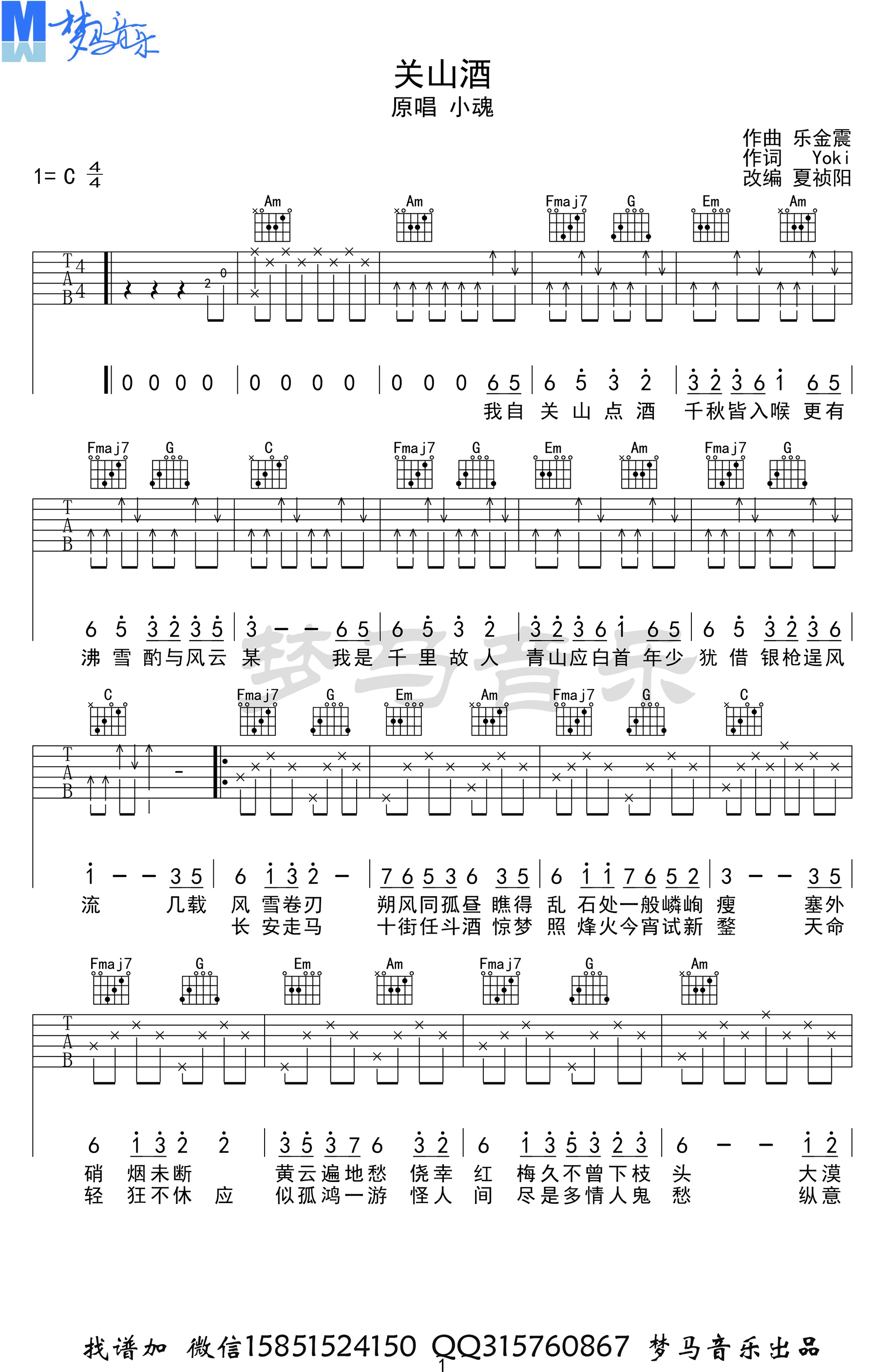 曲谱介绍: 《关山酒》,小魂的一首很火的古风歌曲,关山酒六线谱,C调弹唱谱,谱子难度不大,弹的方面比较简单,共三张图片谱例。梦马音乐制谱出品,琴谱网网上传更新。 这首歌居然有小魂和等什么君两个版本。里面的主歌旋律是不一样的。小魂是原唱。等什么君应该属于改编翻唱。这个谱子是参照小魂版本来做的。