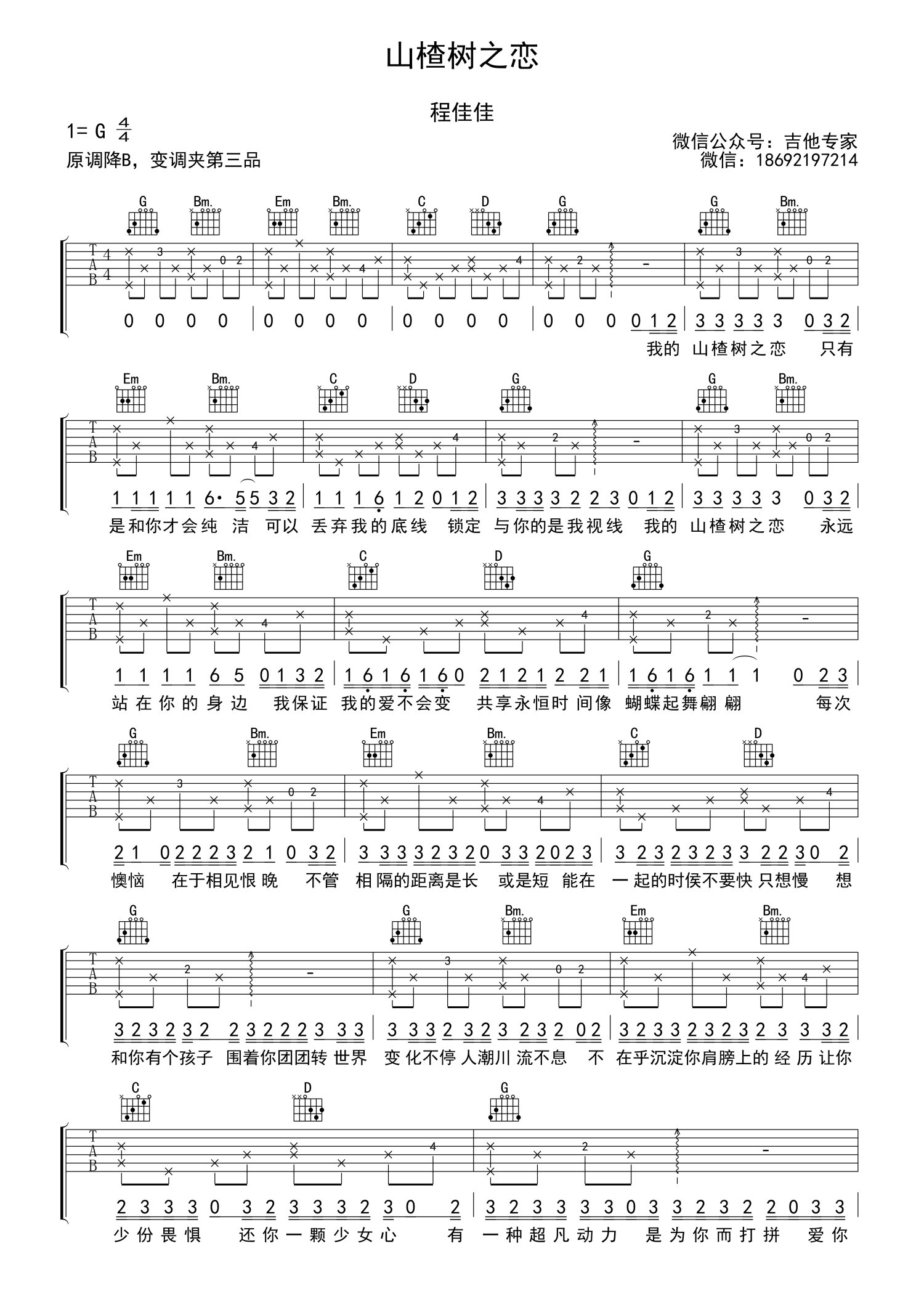 曲谱介绍: 原调降B,变调夹夹第三品,选用G调指法。张艺谋电影《山楂树之恋》三哥静秋的故事感动了无数人,这首歌其实把前奏弹完了,后面都是一样了,如果觉得一个人不太好弹唱,也可以改简单,只弹和弦伴奏就可以啦。