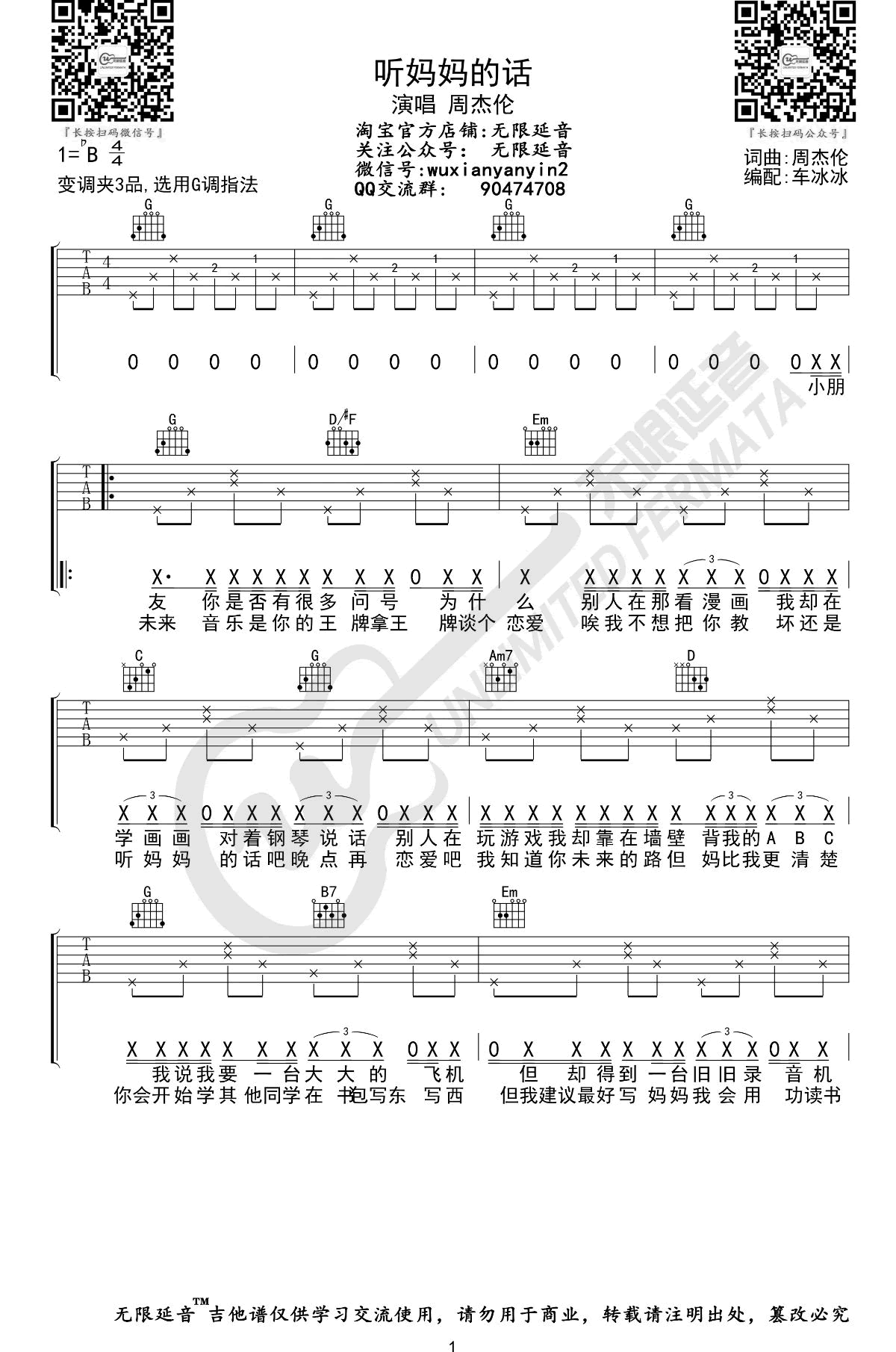 曲谱介绍: 周杰伦《听妈妈的话》吉他弹唱谱,共有3张高清图谱。