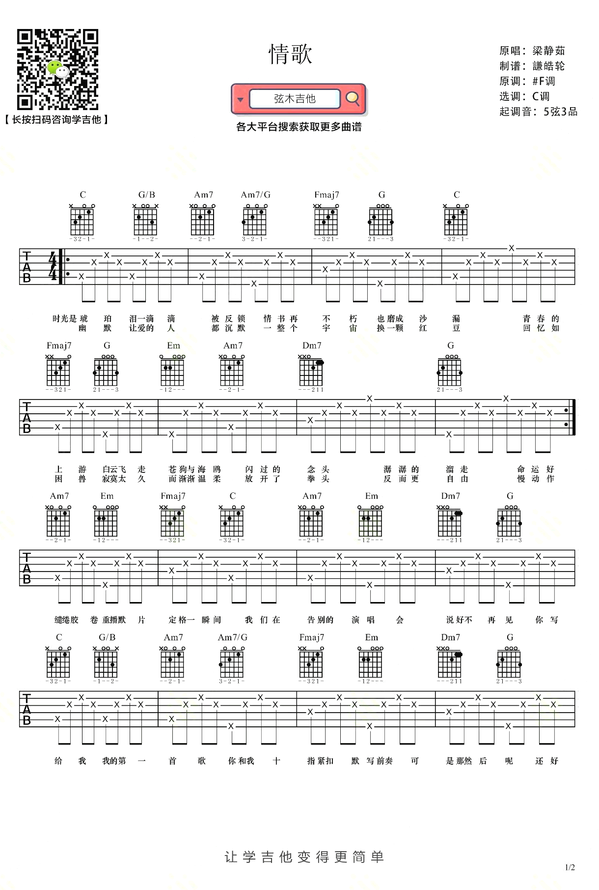 曲谱介绍: 梁静茹《情歌》吉他弹唱谱,共有2张高清图谱,免翻页排版设计。