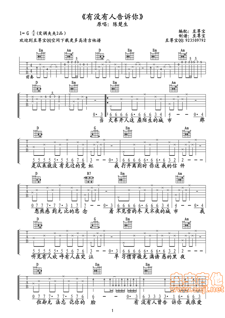 曲谱介绍: 《有没有人告诉你》吉他弹唱谱,共有2张高清图谱,免翻页排版设计。
