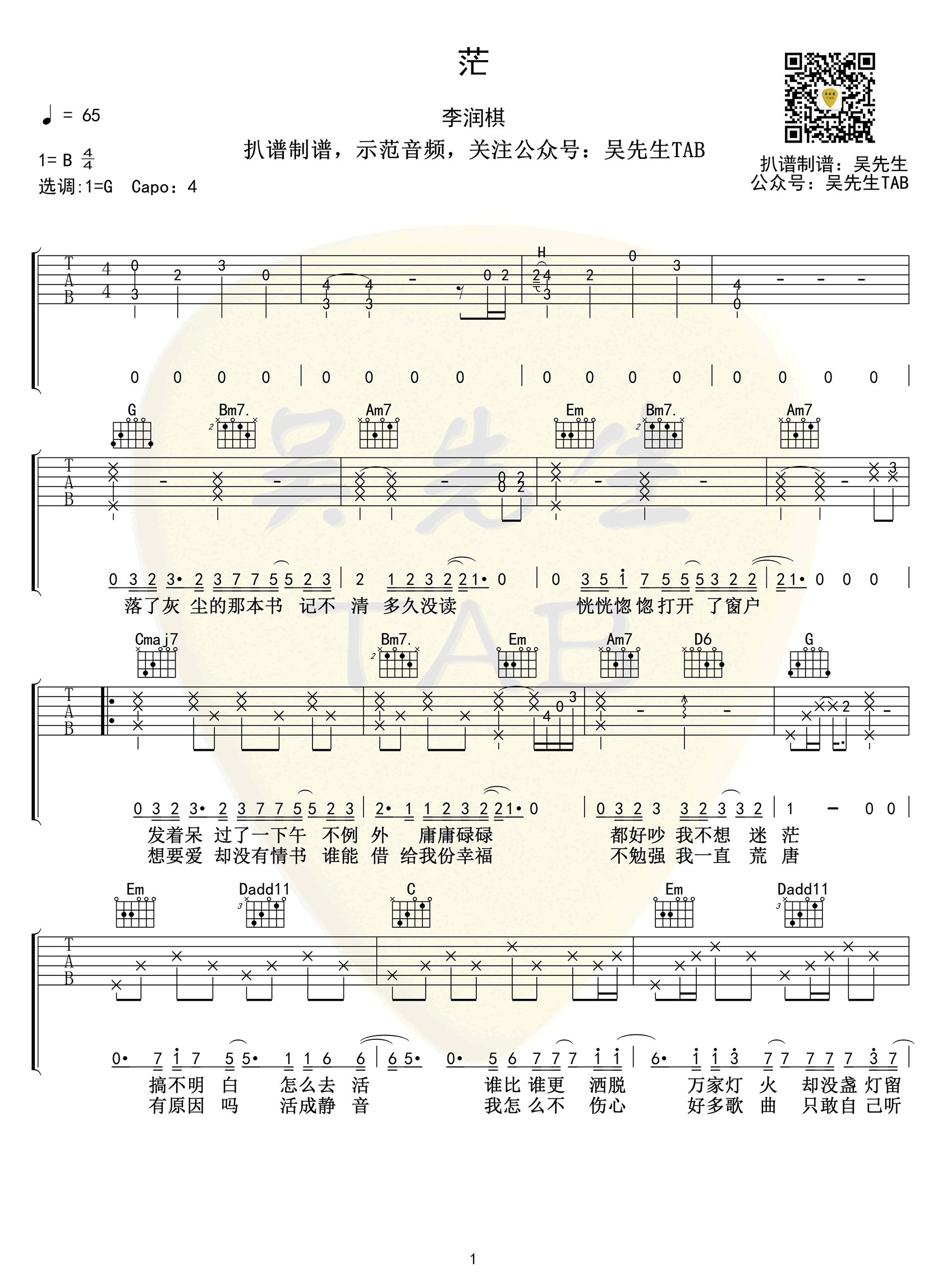 曲谱介绍: 李润祺《茫》吉他弹唱谱,共有3张高清图谱。