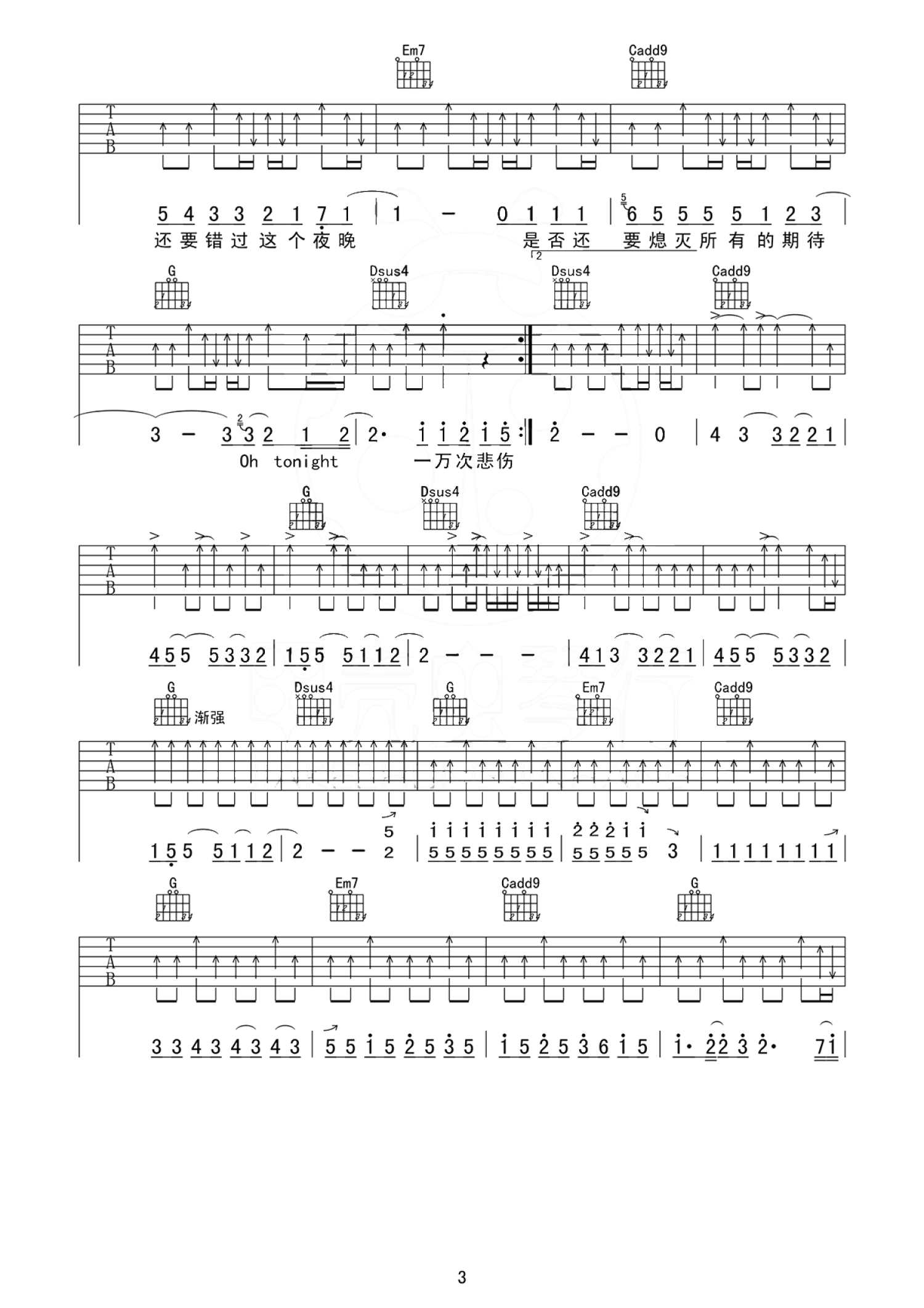 曲谱介绍: 一万次悲伤吉他谱,逃跑计划乐队的一首代表歌曲,一万次悲伤六线谱,高清图片谱,原曲B调,CAPO夹四品,愿你经历无数次的悲伤之后,依然心存光明,不忘初心。我们最终都会找到自己的归属与自身所追求的事物,青春不朽,只是一万次的悲伤。