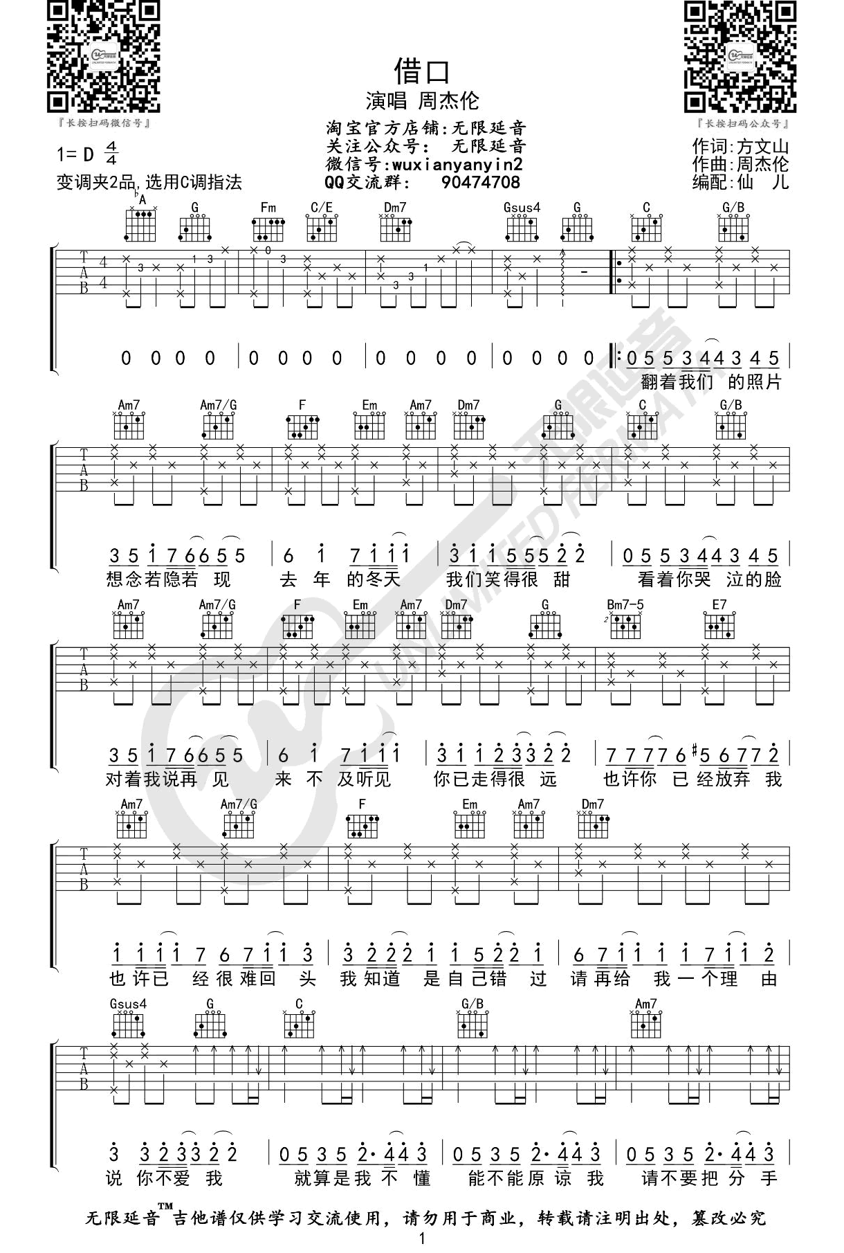 曲谱介绍: 周杰伦《借口C调》吉他弹唱谱,采用C调指法编配,共有2张高清图谱,免翻页排版设计。