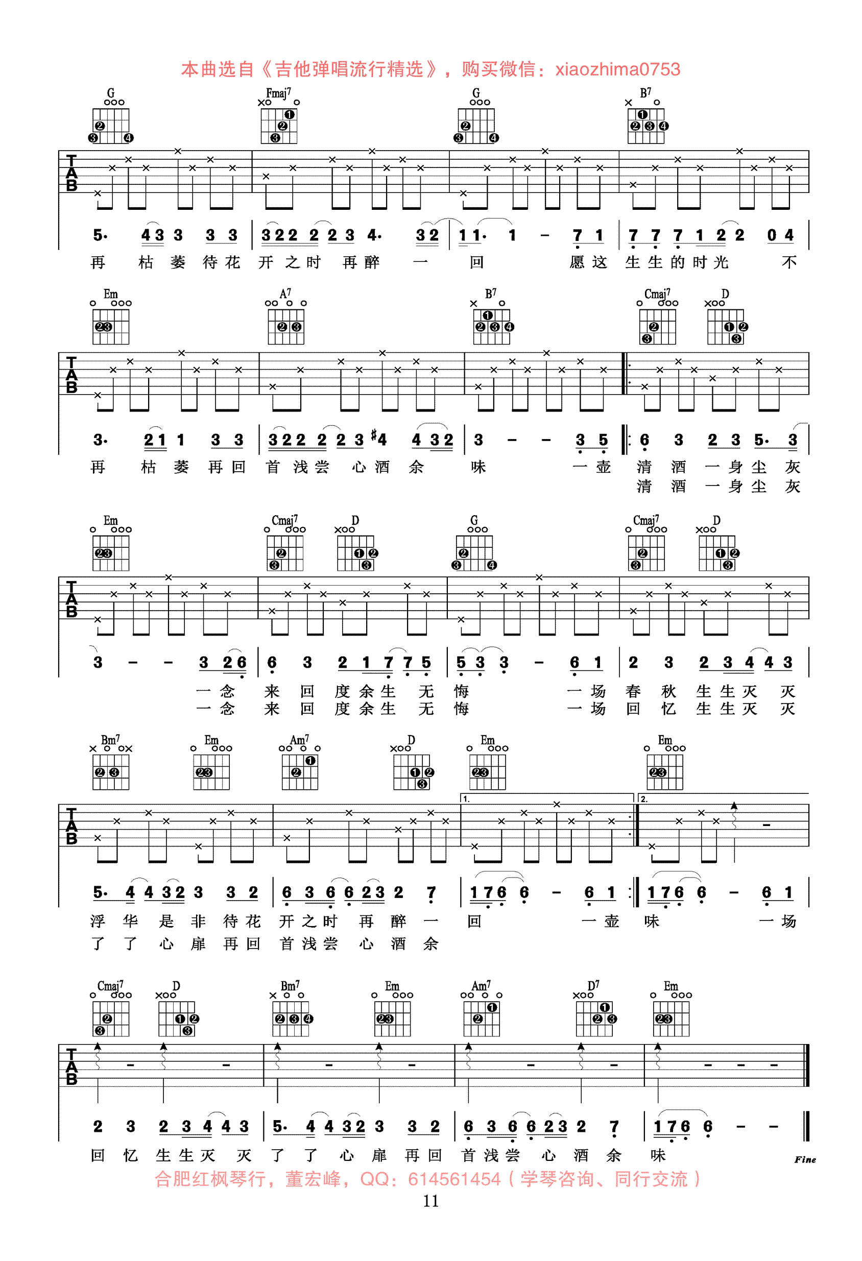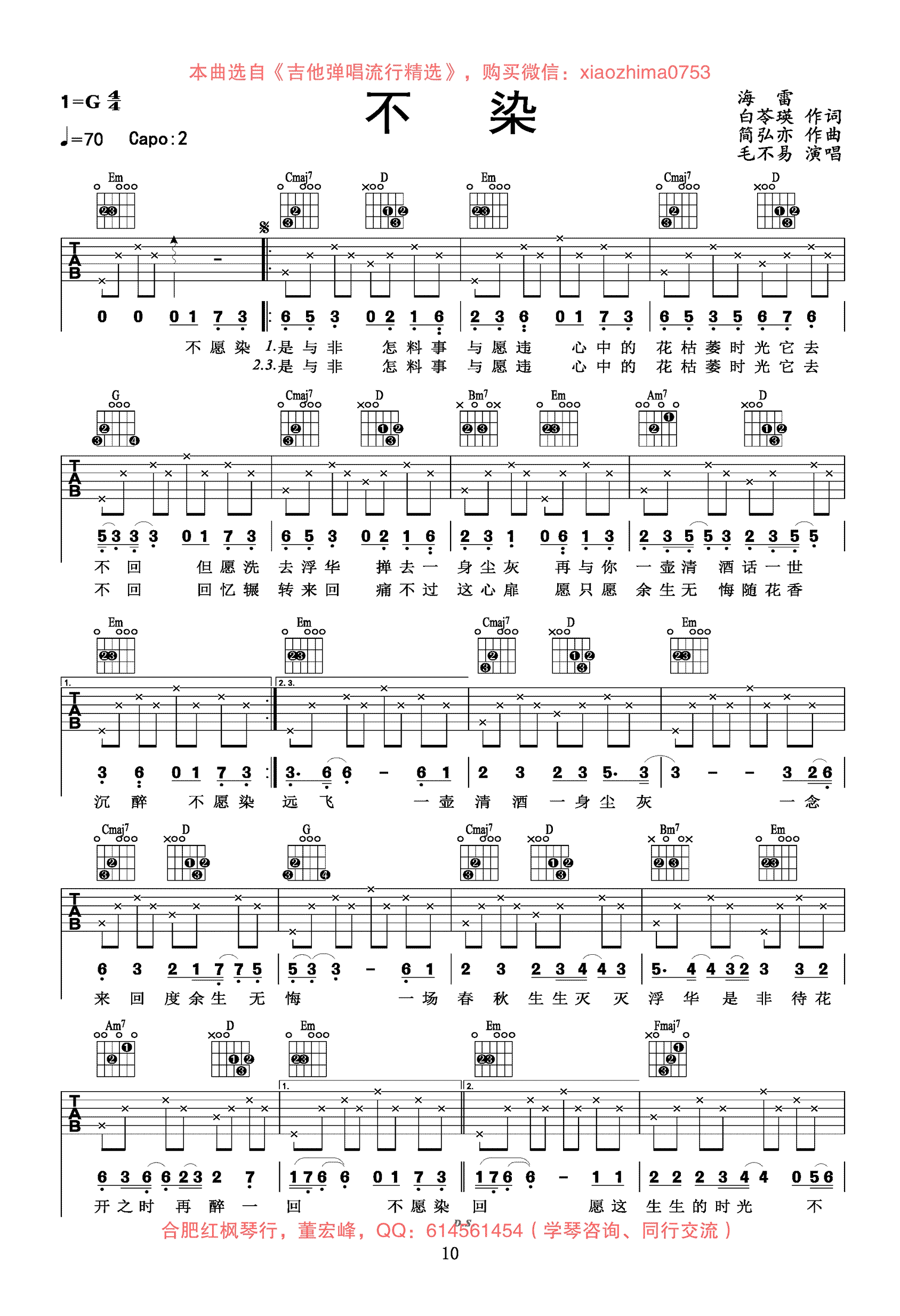 曲谱介绍: 毛不易《不染》,《香蜜沉沉烬如霜》主题曲,不染六线谱,G调弹唱谱,CAPO夹二品。两张图片谱,董宏峰编配分享,琴谱网网整理上传。 毛不易醇厚磁性的嗓音,如一杯温酒,带着不符合他年纪的沧桑,将世间的是是非非纷纷扰扰,都隔绝在自身内心之外,洗去浮华浅吟低唱出一生无悔的淡泊从容。