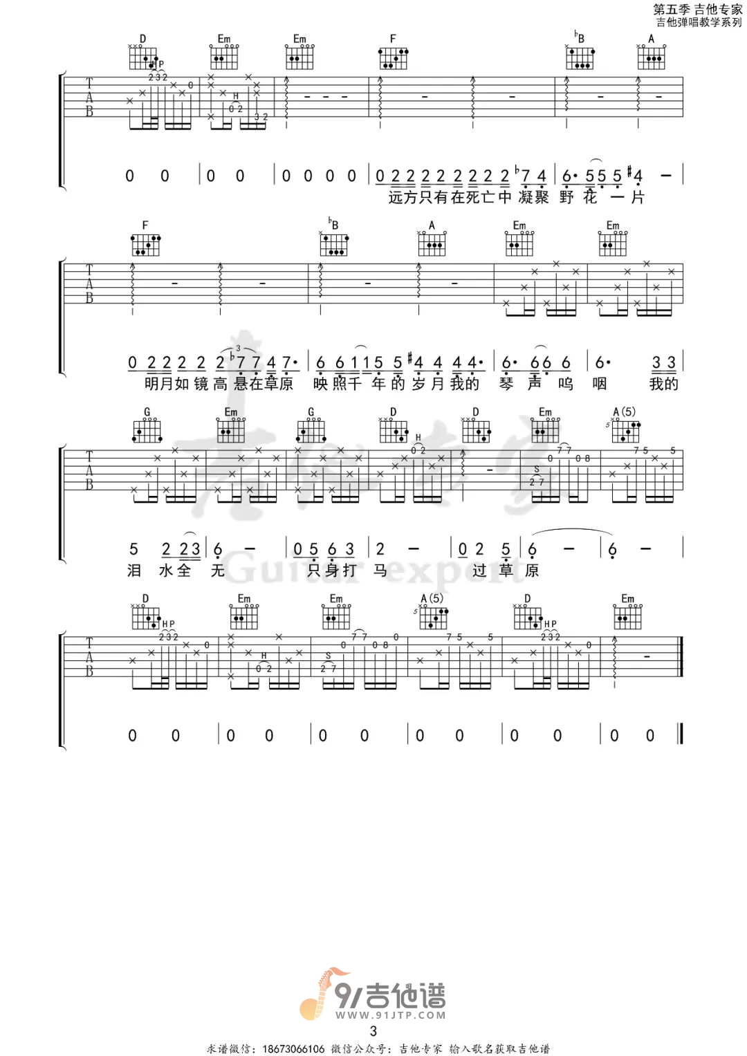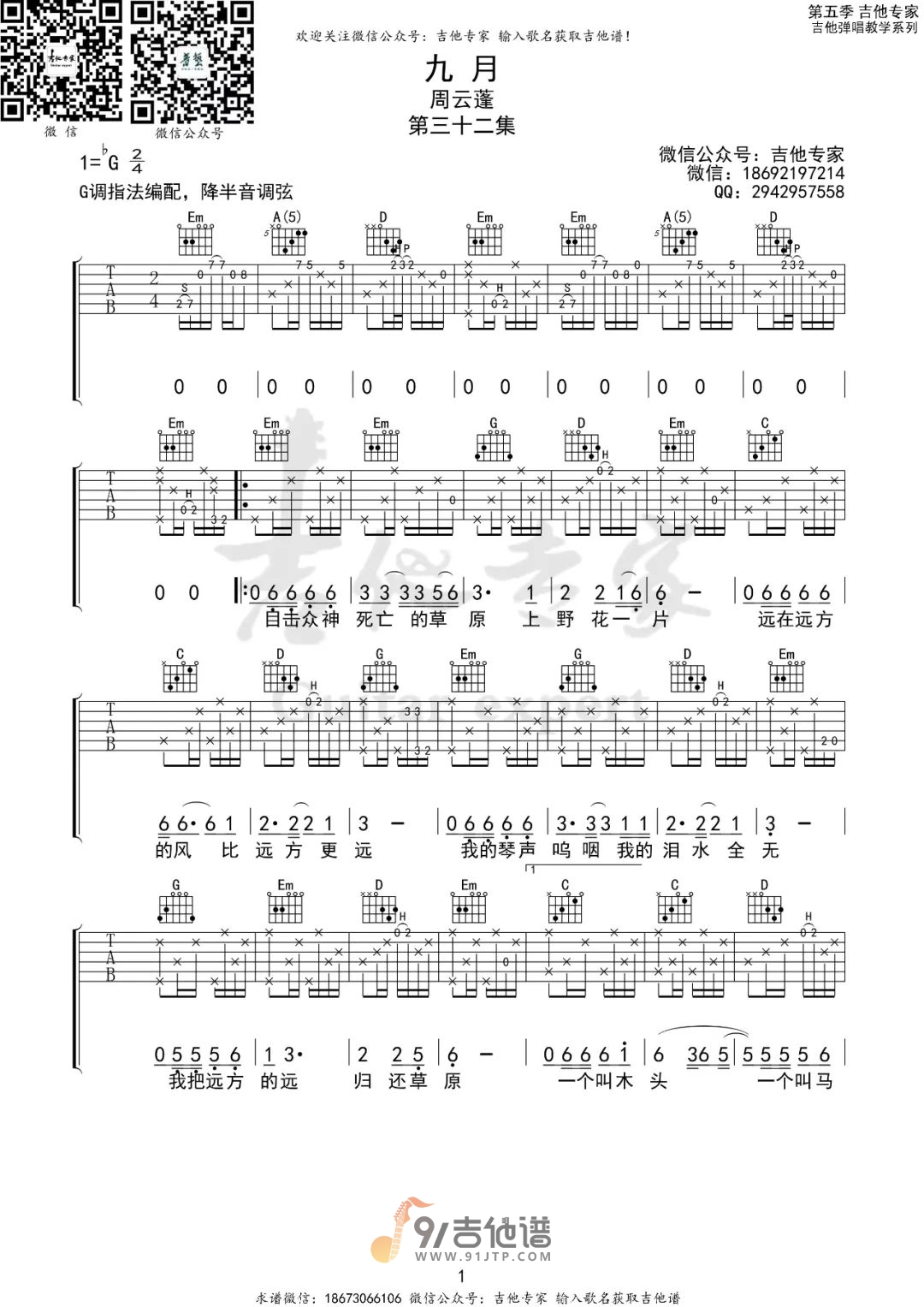 曲谱介绍: 曲谱简介:九月吉他谱,周云蓬演唱的一首歌曲,2/4拍的节奏,这首歌曲的原调为#F调,这里曲谱采用了G调指法进行编配,演唱时降半音调弦可回到原调,也可根据个人实际嗓音情况选择不降音或夹几品。曲谱由吉他专家编配出品。盲人歌手周云蓬演绎的这首歌,优美、孤寂、悲壮、忧伤,仿佛看到了海子走过草原孤独的身影,马头琴声在草原的天空飘荡着,飘向远方。