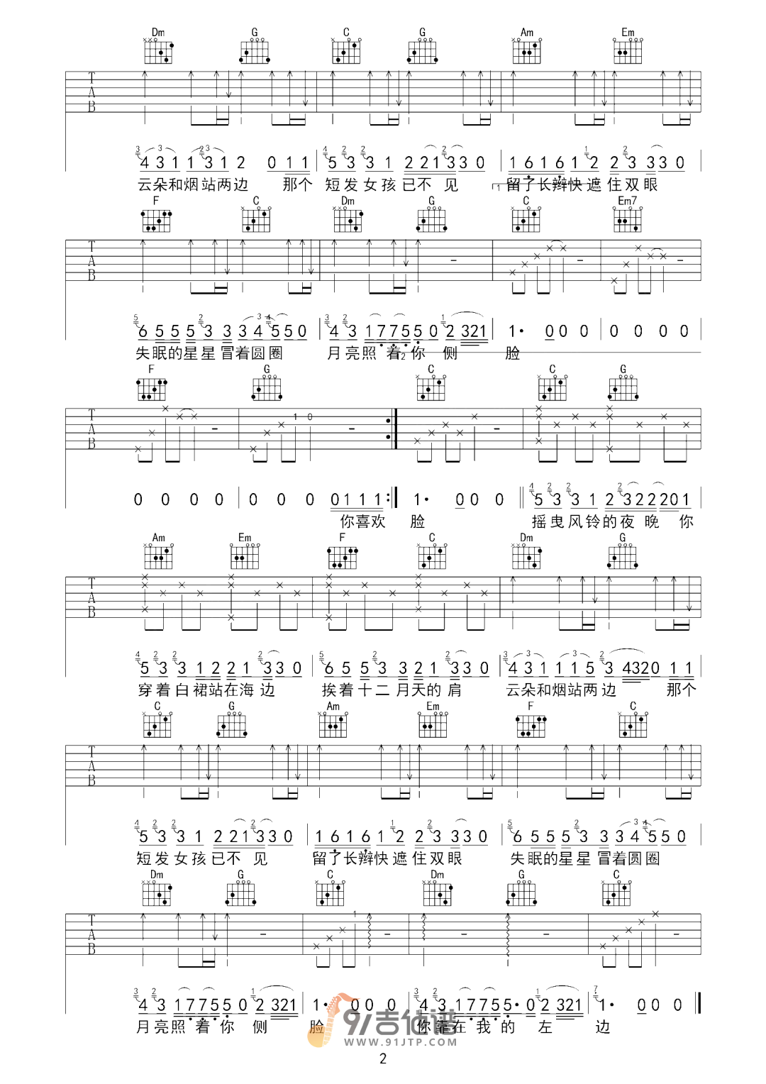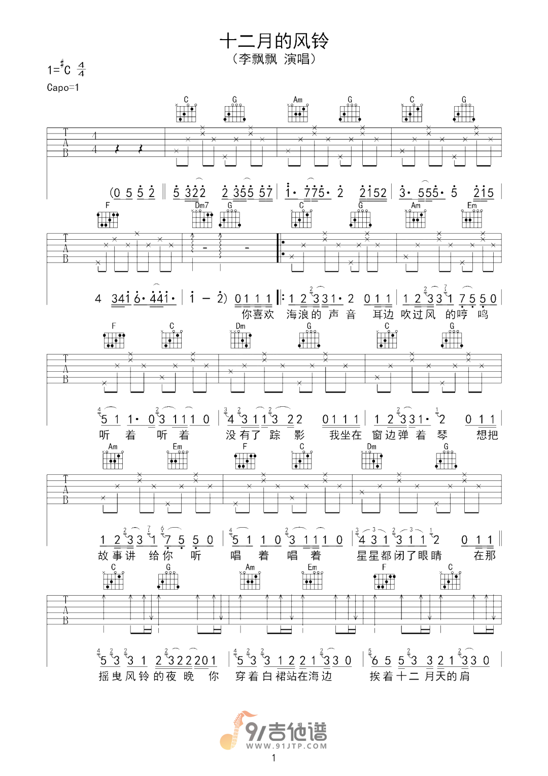 曲谱介绍: 曲谱简介:十二月的风铃吉他谱,李飘飘演唱的一首歌曲,4/4拍的节奏,这首歌曲的原调为#C调,这里曲谱采用了C调指法进行编配,演唱时夹变调夹1品可回到原调,也可根据个人实际嗓音情况选择。曲谱由琴谱网更新上传,共2张高清图片弹唱吉他谱例,曲谱来源于网络转载,编配制谱者暂不详。“在那摇曳风铃的夜晚,你穿着白裙站在海边,挨着十二月天的肩,云朵和烟站两边,那个短发女孩已不见。”