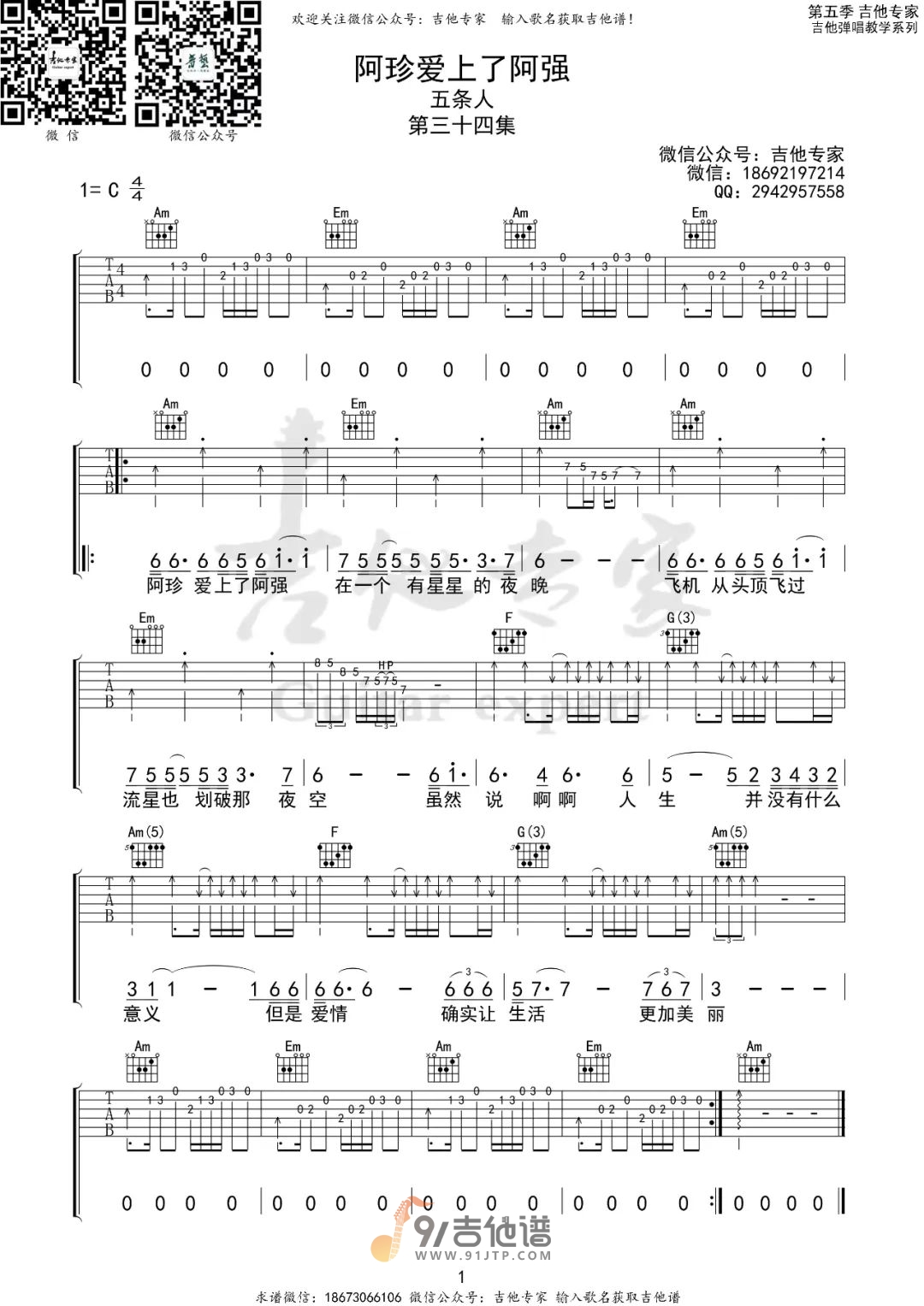 曲谱介绍: 曲谱简介:阿珍爱上了阿强吉他谱,五条人演唱的一首歌曲,4/4拍的节奏,这首歌曲的原调为C调,这里曲谱采用了C调指法进行编配,演唱时可不夹变调夹,曲谱由吉他专家编配出品。这首歌唱出了社会底层男女的平凡爱情 每一句歌词,每一段旋律 都映射出生活的本色。听《阿珍爱上了阿强》,就像坐在小镇街边的西瓜摊,身旁烧烤摊烟雾缭绕、嘈杂不堪,但那个路过的穿着百褶裙的女生依然美得不像话。