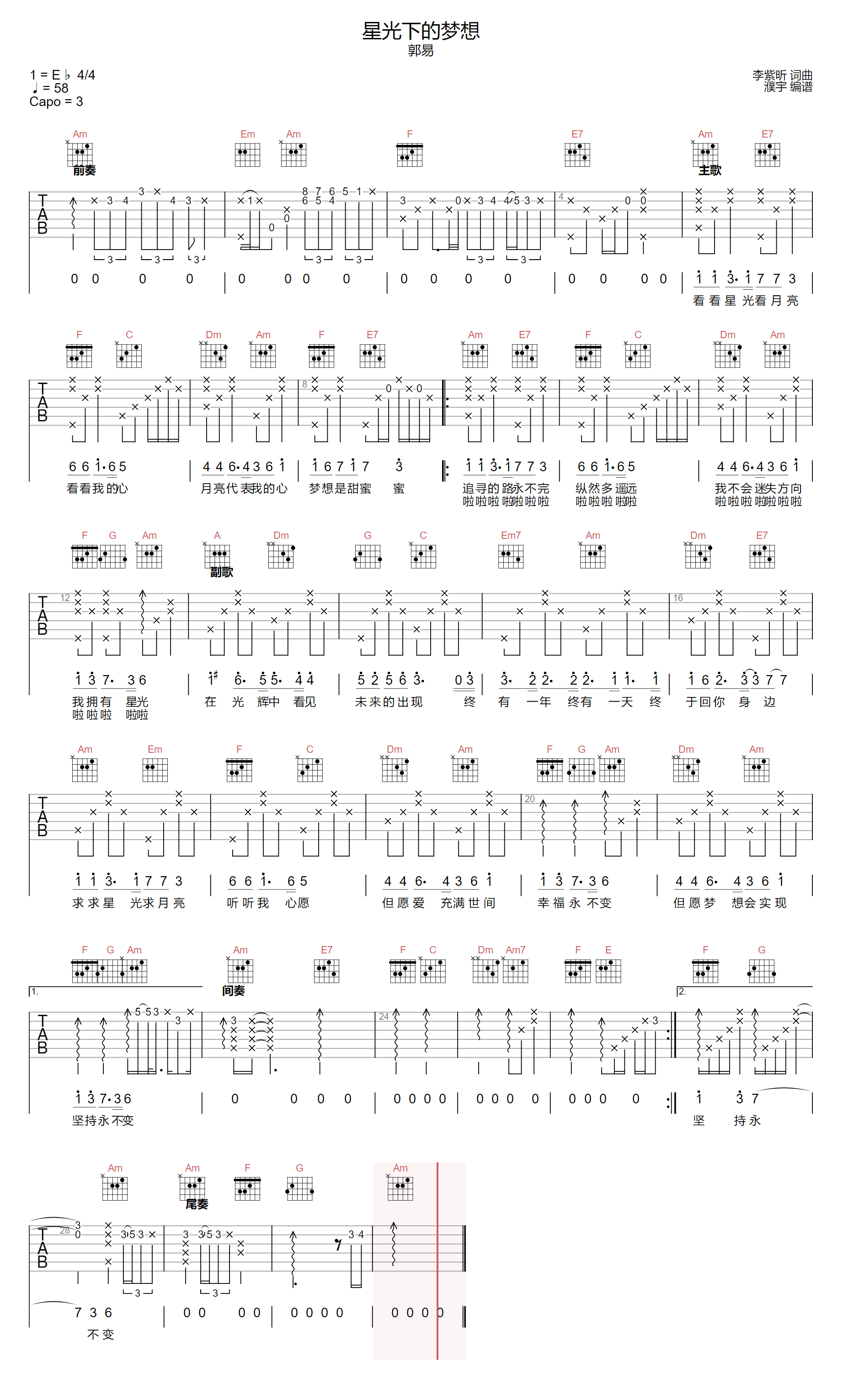 曲谱介绍: 吉他谱介绍:星光下的梦想吉他谱,郭易演唱的一首歌曲,4/4拍的节奏,这首歌曲的原调为降E调,这里曲谱采用了C调指法进行编配,演唱时夹变调夹3品可回到原调,也可根据个人实际嗓音情况选择。曲谱由琴谱网更新上传,共1张高清图片弹唱吉他谱例,来源于@濮宇编配出品。这首歌是《喜羊羊与灰太狼之兔年顶呱呱》的主题曲、《奇思妙想喜羊羊》、《喜羊羊与灰太狼之给快乐加油》、《喜羊羊与灰太狼之决战次时代》的插曲。