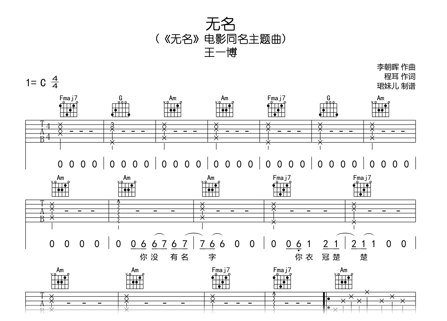 无名吉他谱 - 王一博 - C调吉他弹唱谱