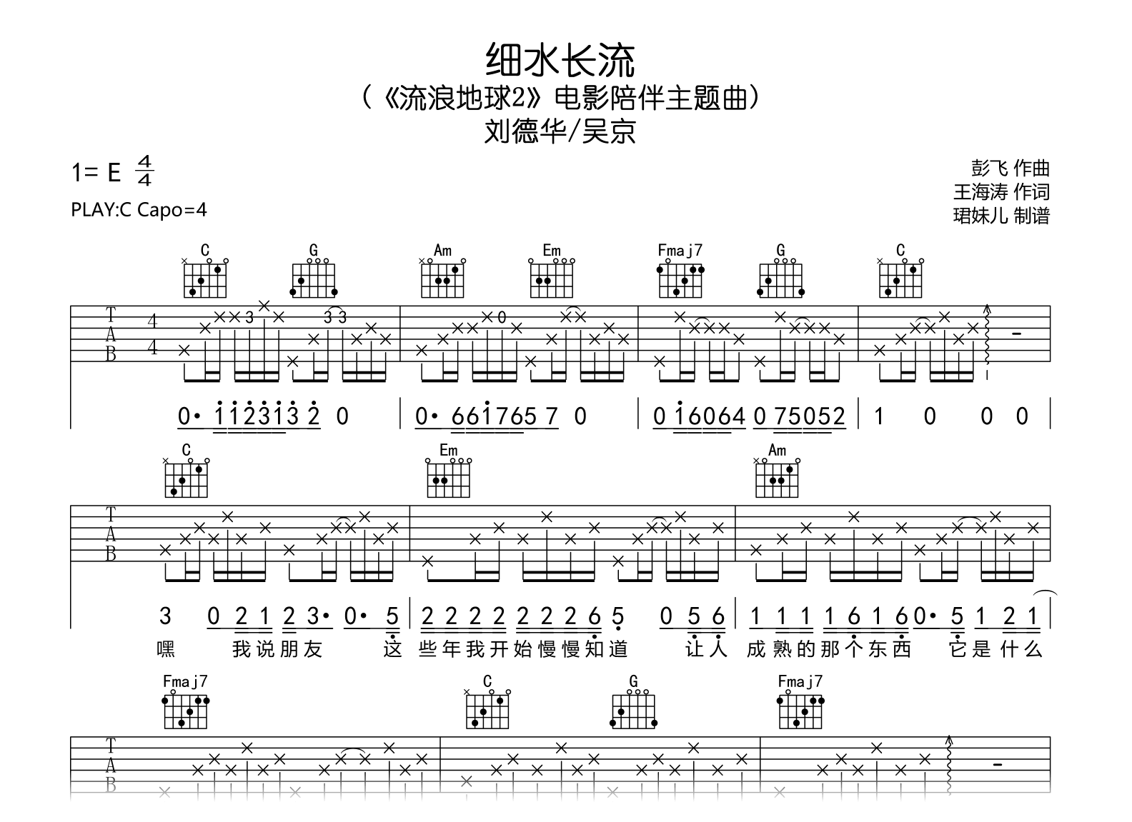 曲谱介绍: 细水长流吉他谱,刘德华/吴京献唱电影《流浪地球2》陪伴主题曲,《细水长流》吉他弹唱谱,原调E,用C调指法,建议变调夹4品,速度65BPM,演奏易上手难度较简单。