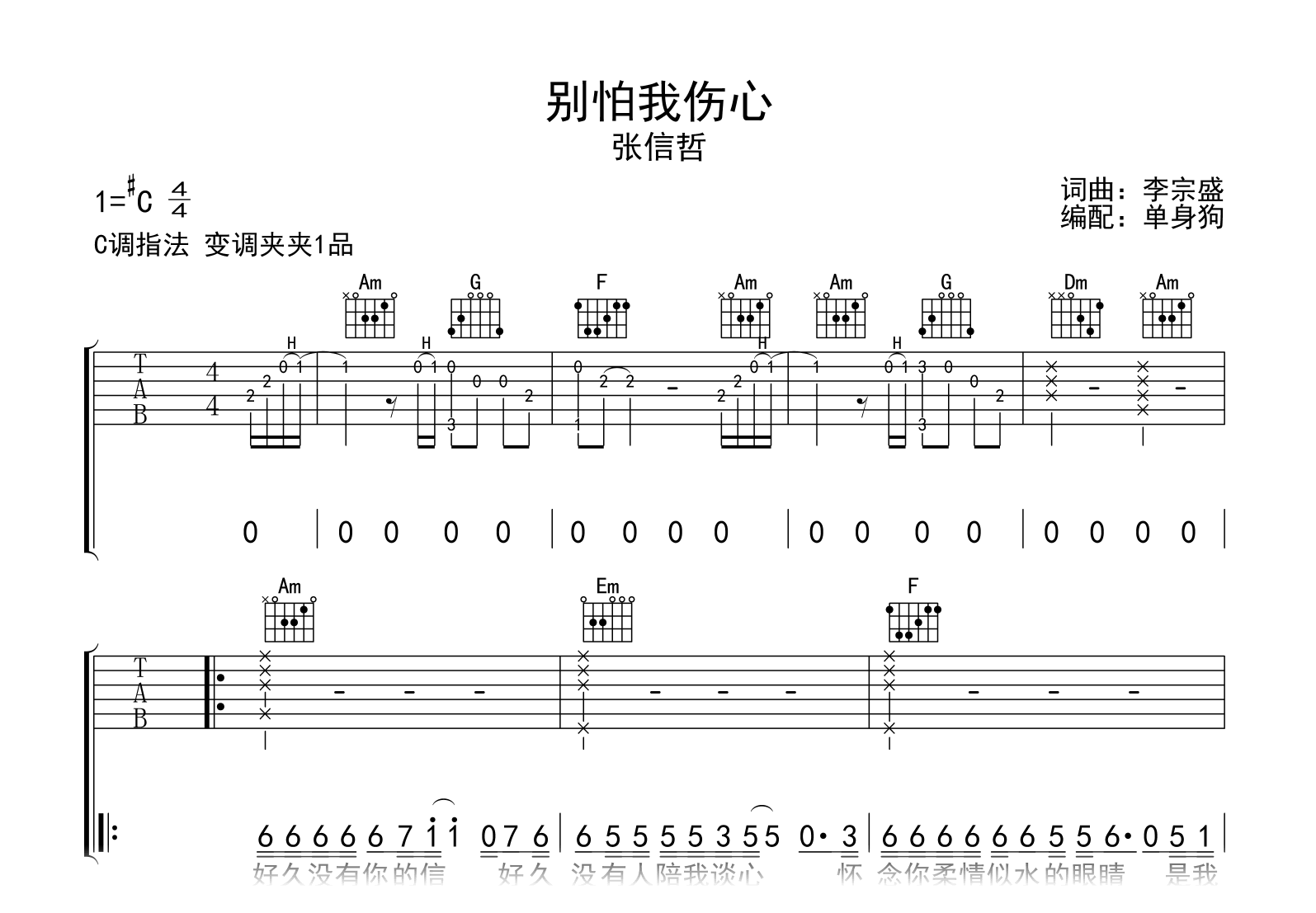 别怕我伤心吉他谱 - 张信哲 - C调吉他弹唱谱