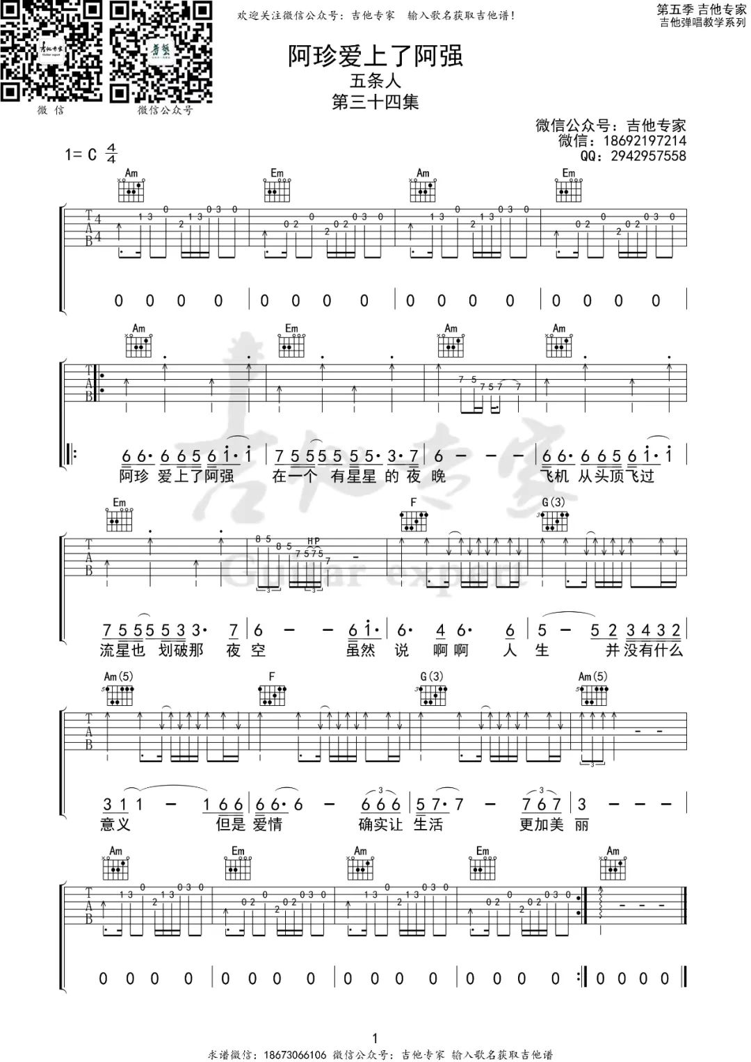 曲谱介绍: 吉他谱介绍:阿珍爱上了阿强吉他谱,五条人演唱的一首歌曲,4/4拍的节奏,这首歌曲的原调为C调,这里曲谱采用了C调指法进行编配,演唱时可不夹变调夹,曲谱由琴谱网更新上传,共1张高清图片弹唱吉他谱例,来源于@吉他专家编配出品。这首歌唱出了社会底层男女的平凡爱情 每一句歌词,每一段旋律 都映射出生活的本色。听《阿珍爱上了阿强》,就像坐在小镇街边的西瓜摊,身旁烧烤摊烟雾缭绕、嘈杂不堪,但那个路过的穿着百褶裙的女生依然美得不像话。