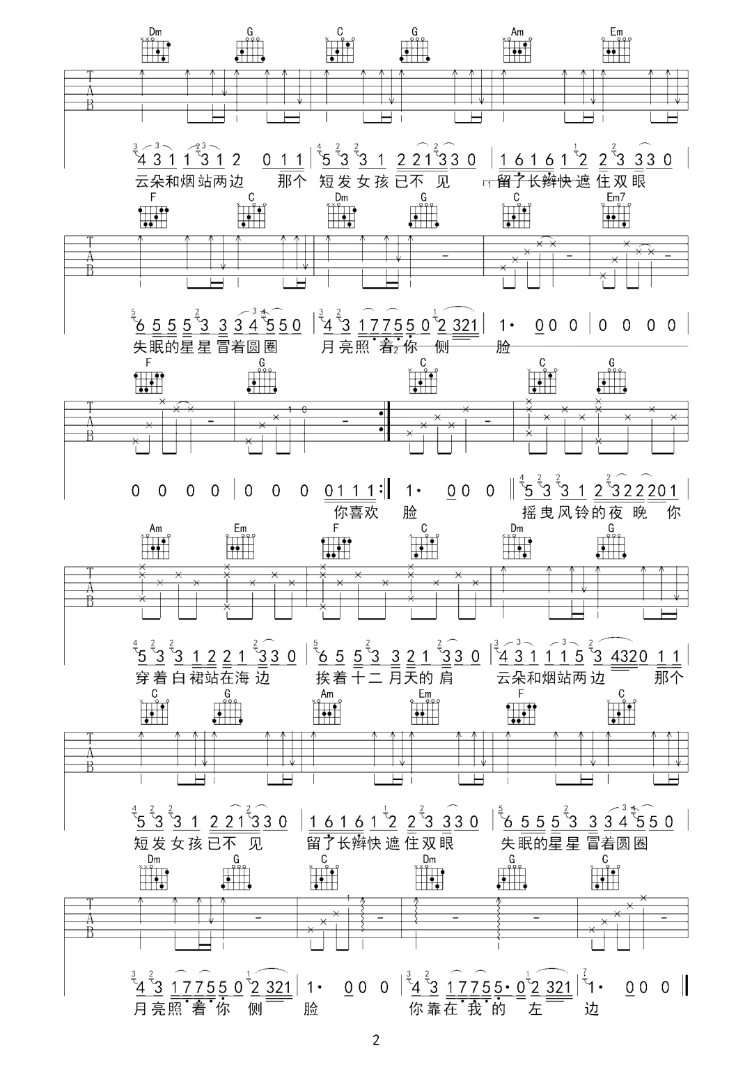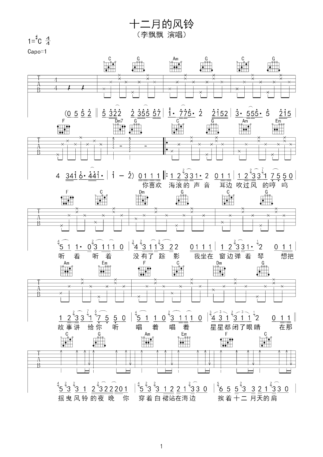 曲谱介绍: 吉他谱介绍:十二月的风铃吉他谱,李飘飘演唱的一首歌曲,4/4拍的节奏,这首歌曲的原调为#C调,这里曲谱采用了C调指法进行编配,演唱时夹变调夹1品可回到原调,也可根据个人实际嗓音情况选择。曲谱由琴谱网更新上传,共2张高清图片弹唱吉他谱例,曲谱来源于网络转载,编配制谱者暂不详。“在那摇曳风铃的夜晚,你穿着白裙站在海边,挨着十二月天的肩,云朵和烟站两边,那个短发女孩已不见。”