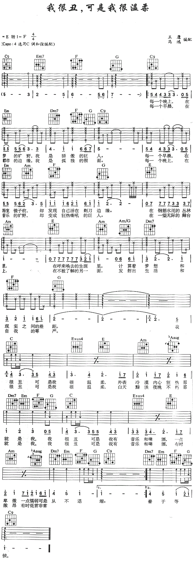 当前位置:琴谱网>吉他弹唱>我很丑,可是我很温柔 赵传 图片