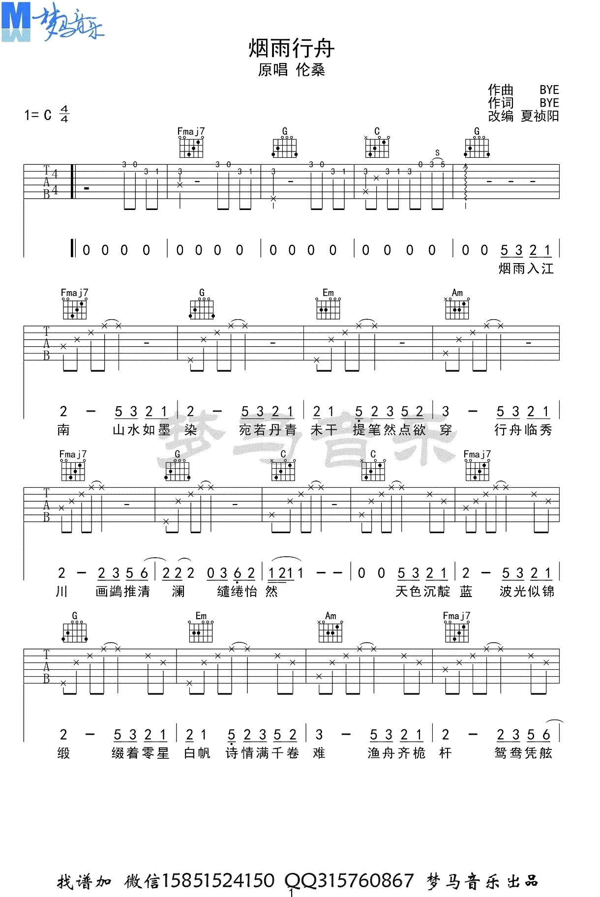 曲谱介绍: 《烟雨行舟》,伦桑的一首唯美古风歌曲。烟雨行舟六线谱,C调指法,完整编配共四张图片谱,梦马音乐制谱出品,琴谱网 网更新上传。