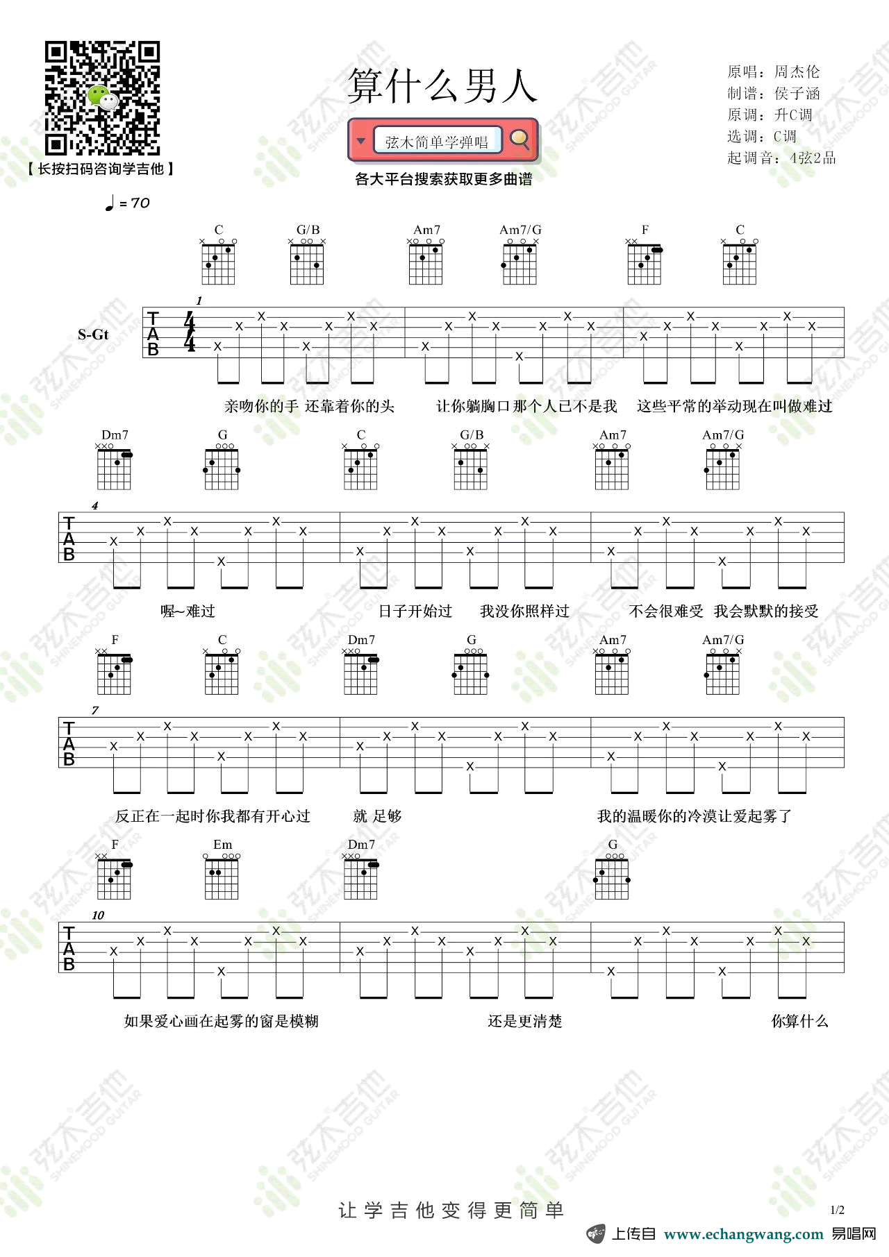 曲谱介绍: 《算什么男人》,周杰伦的一首慢板抒情歌,算什么男人六线谱,选用C调指法,起音调四弦二品,弦木吉他出品,琴谱网 网上传分享。
