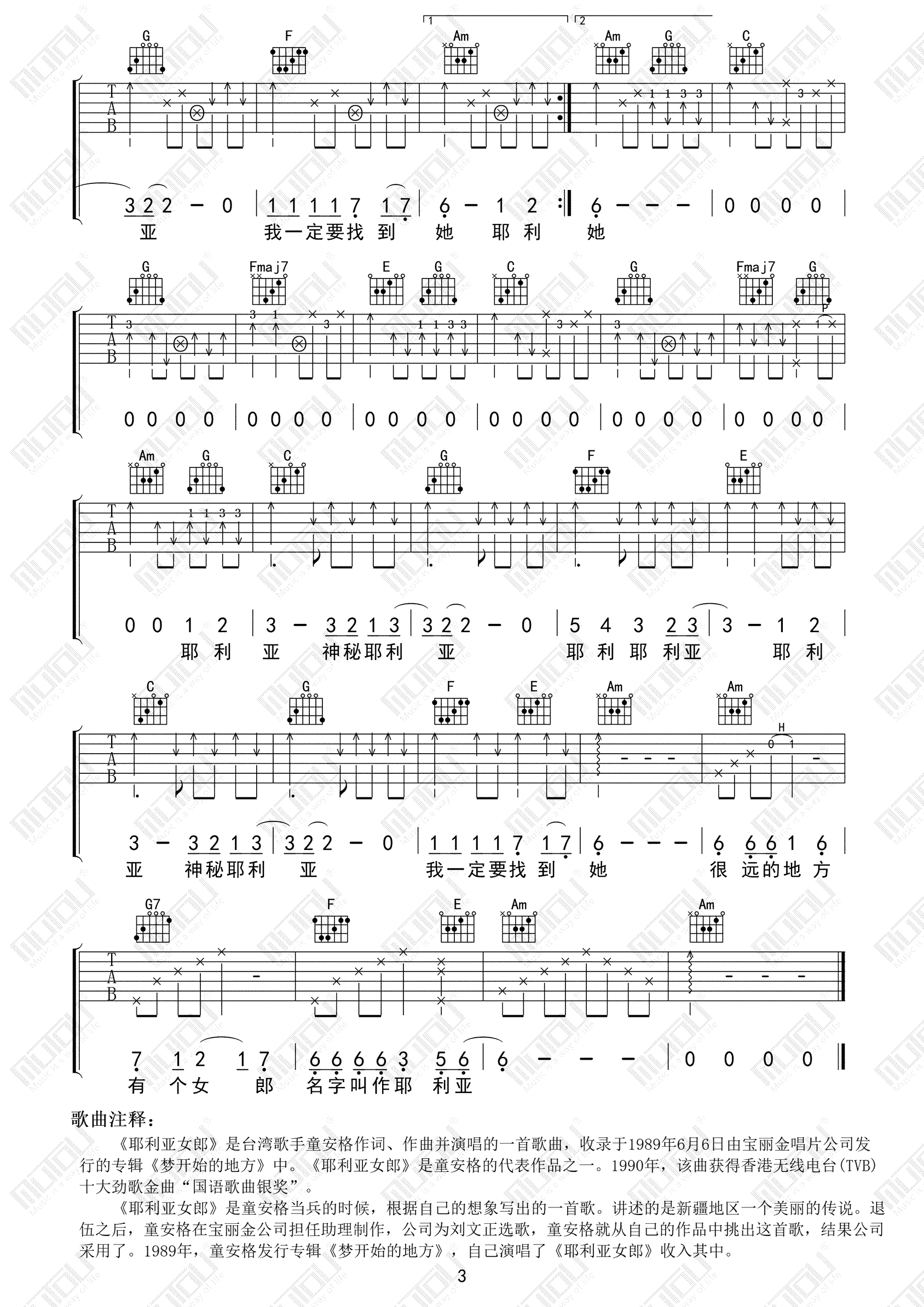 曲谱介绍: 童安格《耶利亚女郎》吉他弹唱谱,共有3张高清图谱。