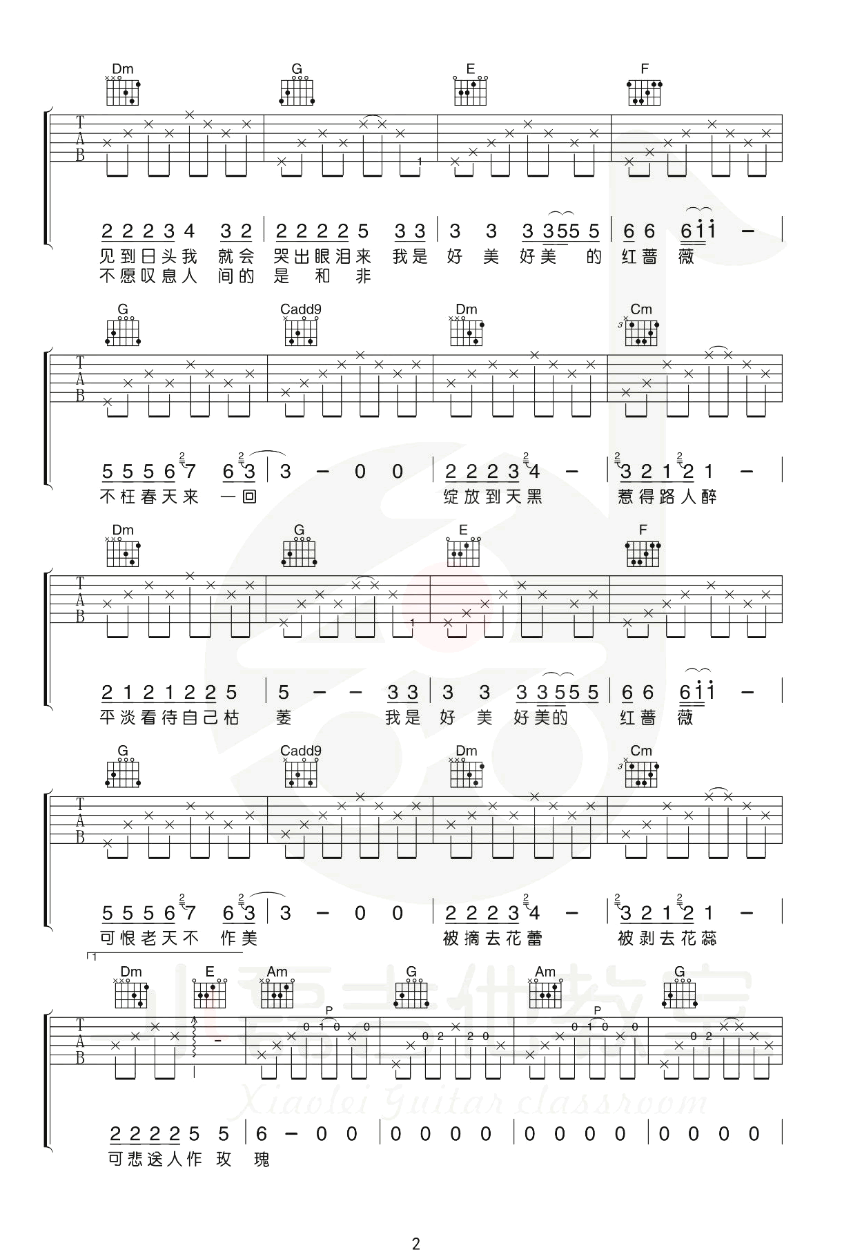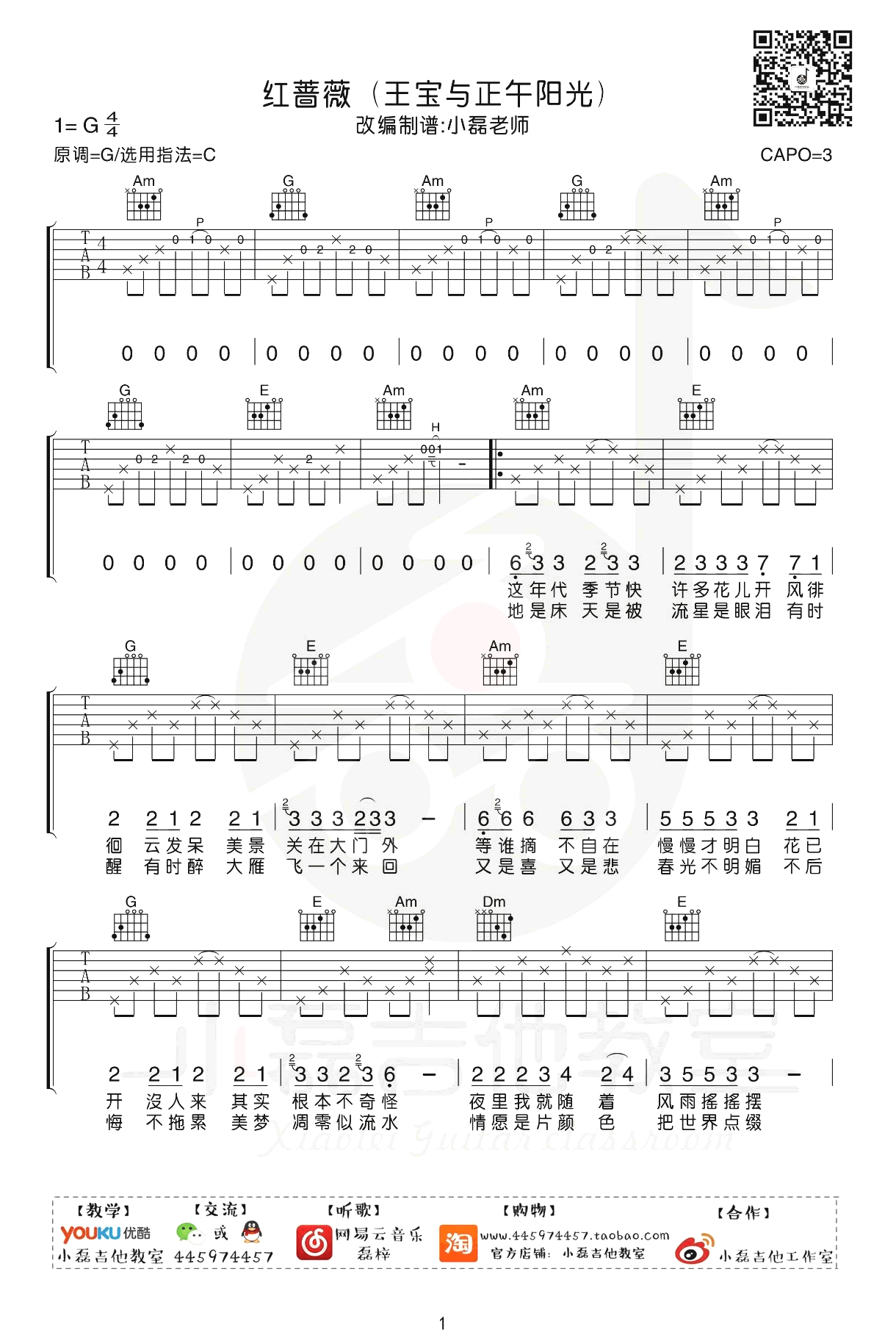 曲谱介绍: 《红蔷薇》,王宝与正午阳光演唱,红蔷薇六线谱,选用C调指法,变调夹夹三品。四张弹唱图片谱,小磊吉他编配出品,并带来教学视频,更新上传。 红蔷薇是非常苦情的一首歌,曾经被很多人翻唱过,比如丽江小倩。老师编排的乐谱看似简单,但是大量保留了原曲中钢琴配器的元素,整曲悠扬委婉,难度不高,是一首非常值得学习的乐谱。