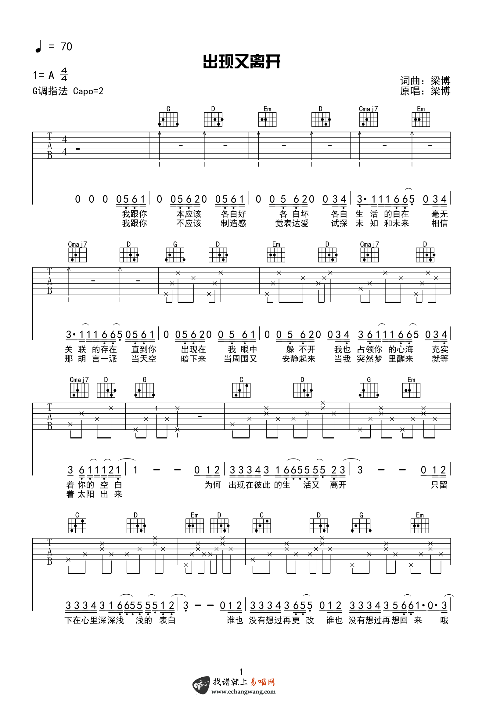 曲谱介绍: 梁博《出现又离开》吉他弹唱谱,共有2张高清图谱,免翻页排版设计。