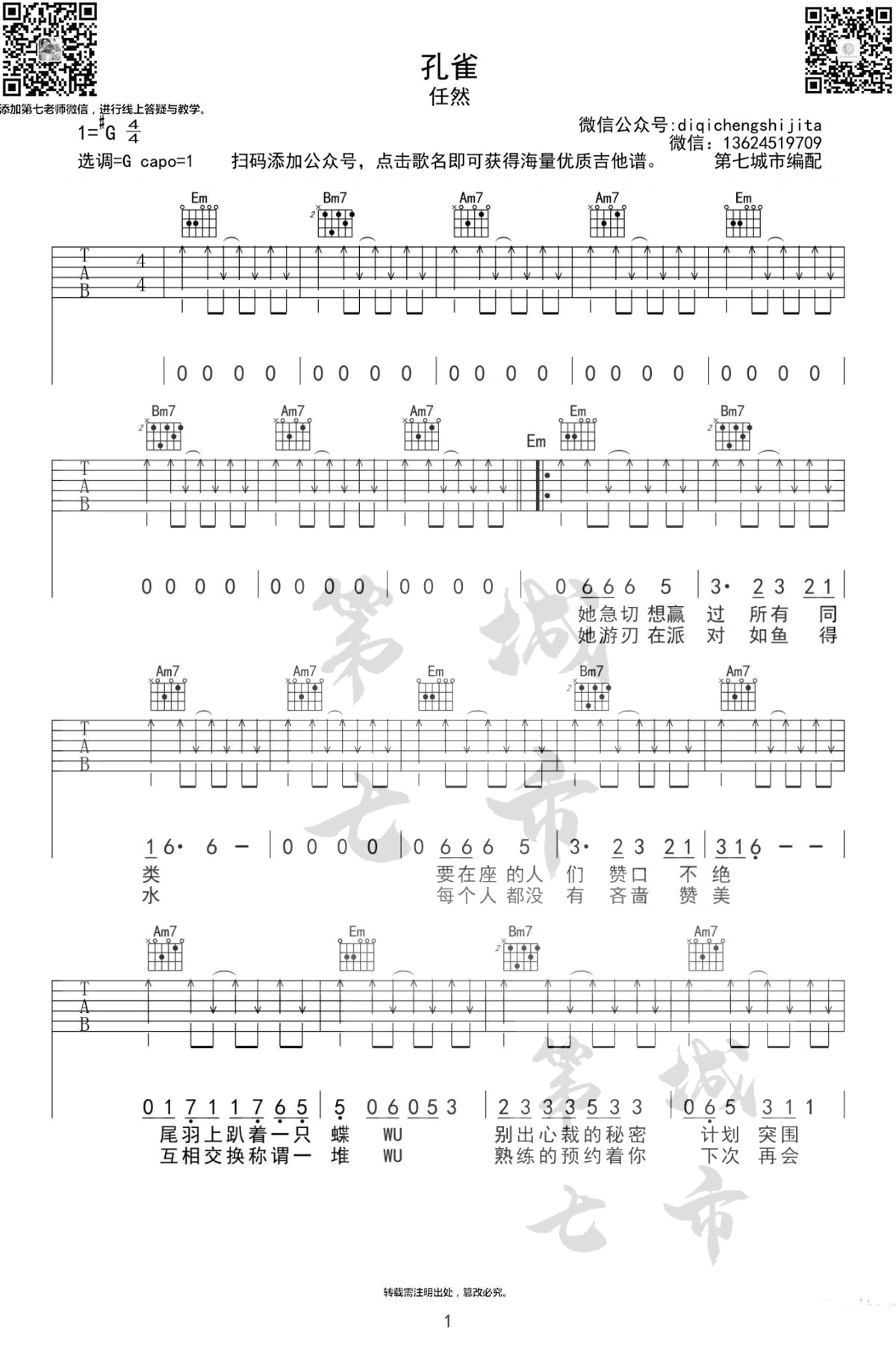 曲谱介绍: 孔雀,任然演唱,G调指法,Capo夹一品。孔雀六线谱,三张弹唱图片谱。第七城市编配制谱,琴谱网 网上传更新。 不同于以往的治愈情歌,任然的这首最新作品,唱出人们在现代社会的迷失心态。其实,孔雀也好麻雀也罢,如何挣脱他人眼光定义的价值标准,以自己的姿态飞翔。
