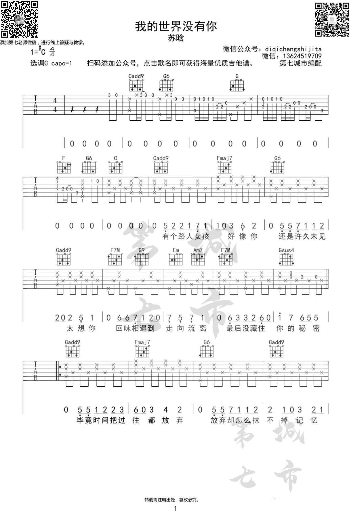 曲谱介绍: 《我的世界没有你》,苏晗演唱的一首网络热门歌曲,我的世界没有你六线谱,原调升C选用C调指法,CAPO夹一品,三张图片谱,第七城市编配制谱,琴谱网网上传分享。 清新苏打水般的声线,甜美刻画了那段情怀的每一种情绪,唱出一份青涩的恋爱回忆,而引发自己的所思所念。