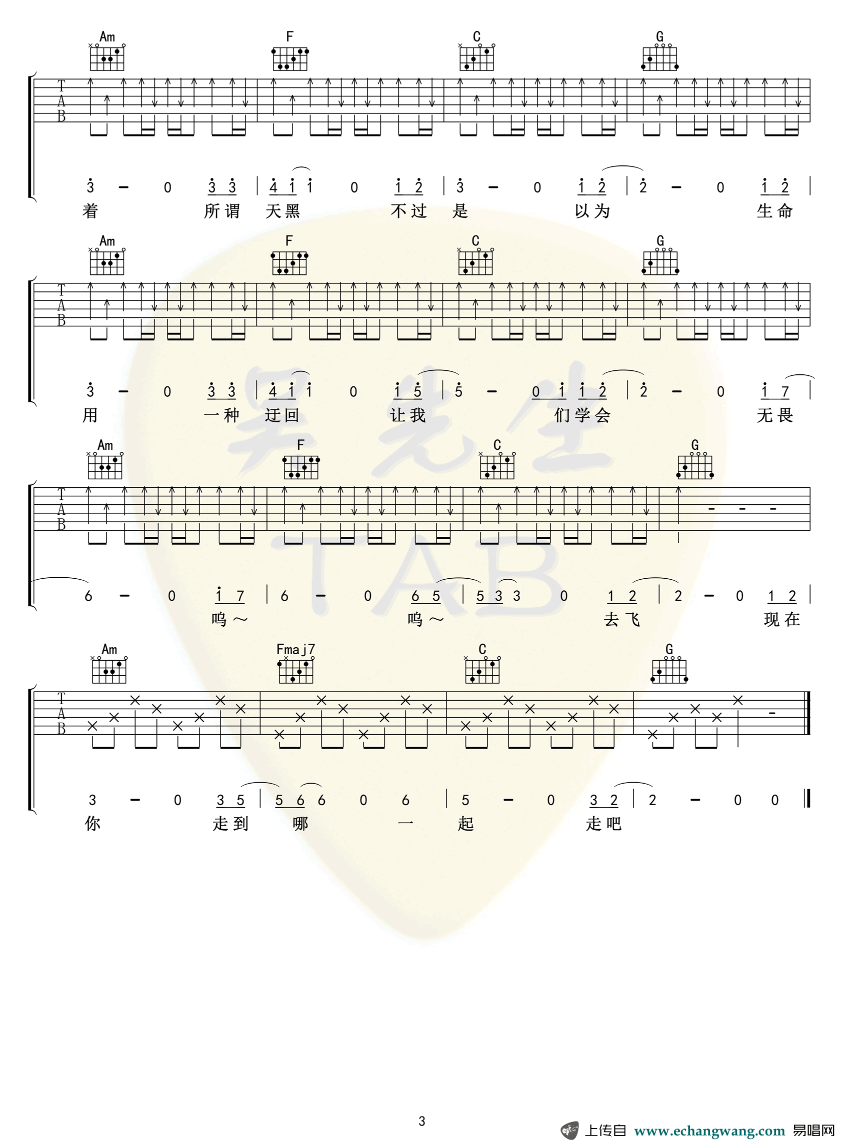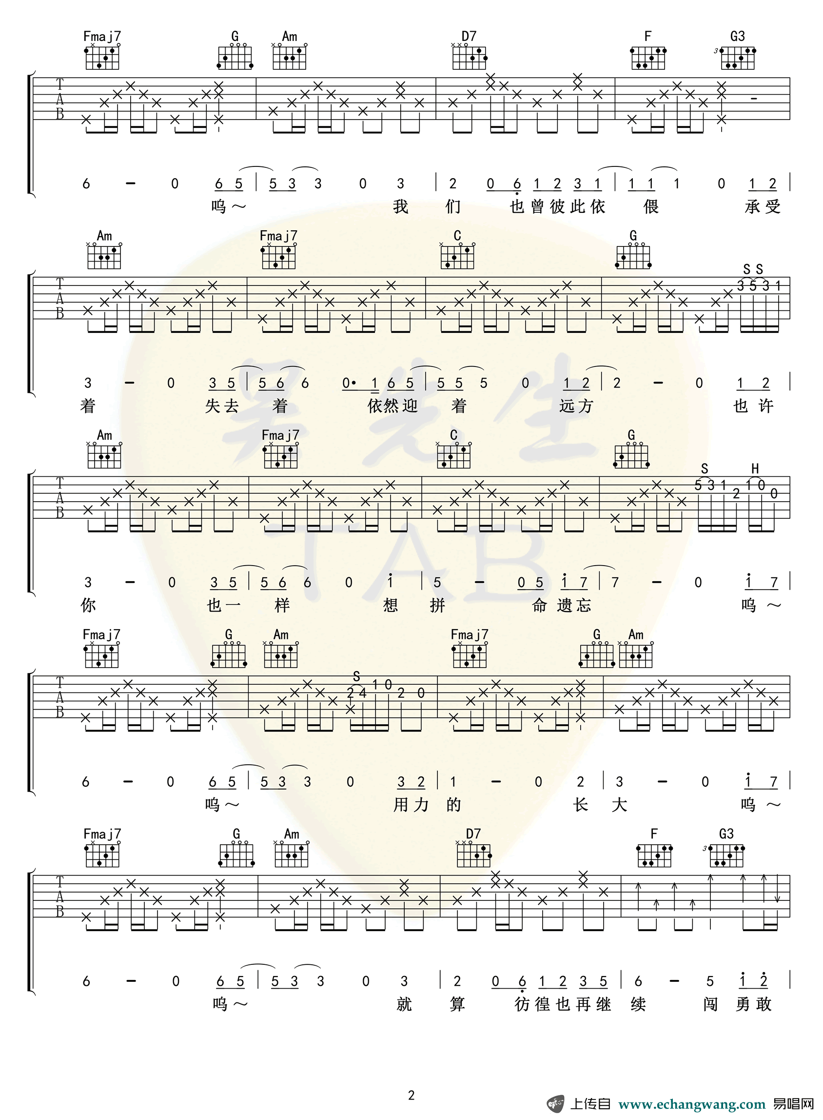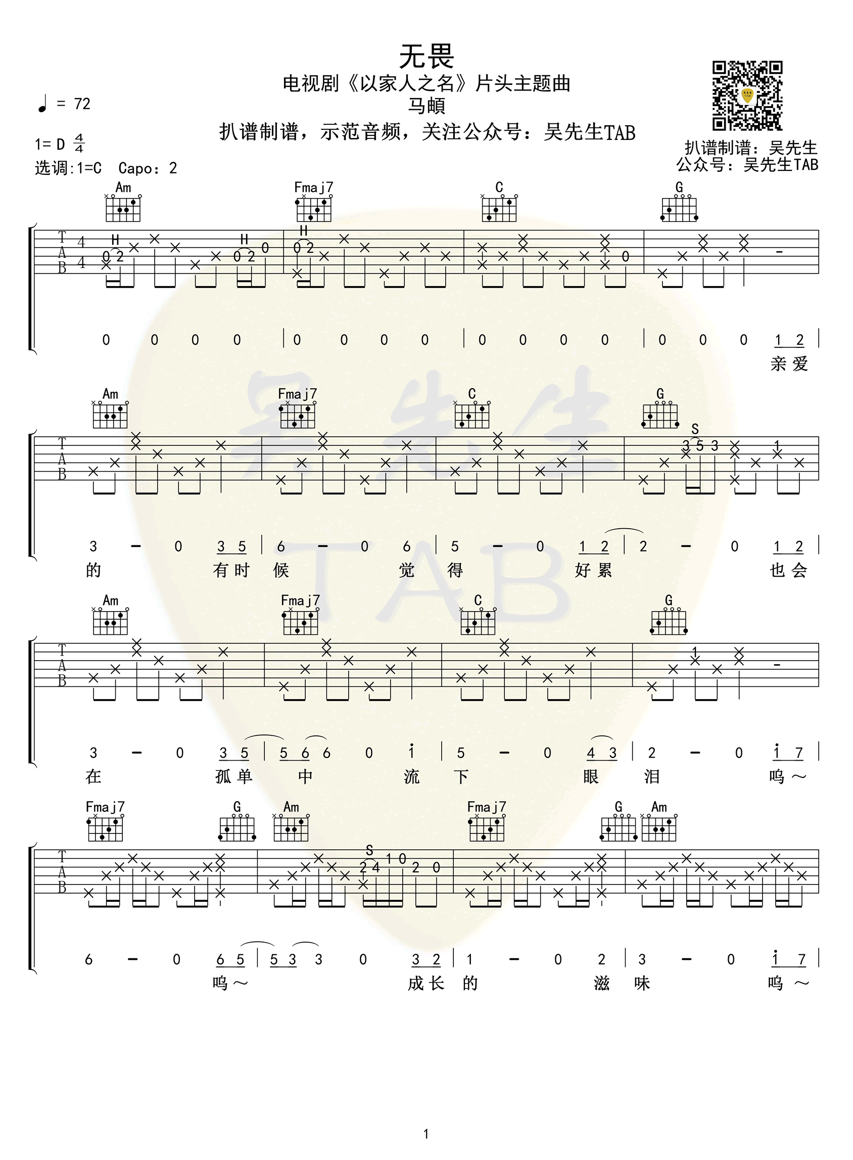 曲谱介绍: 《无畏》,马頔演唱,电视剧《以家人之名》主题曲,无畏六线谱,原调D选调C,Capo夹二品。原曲是两把吉他伴奏,编配上采用的是比较突出的部分。三张高清图片谱由吴先生tab扒谱制谱,更新分享。
