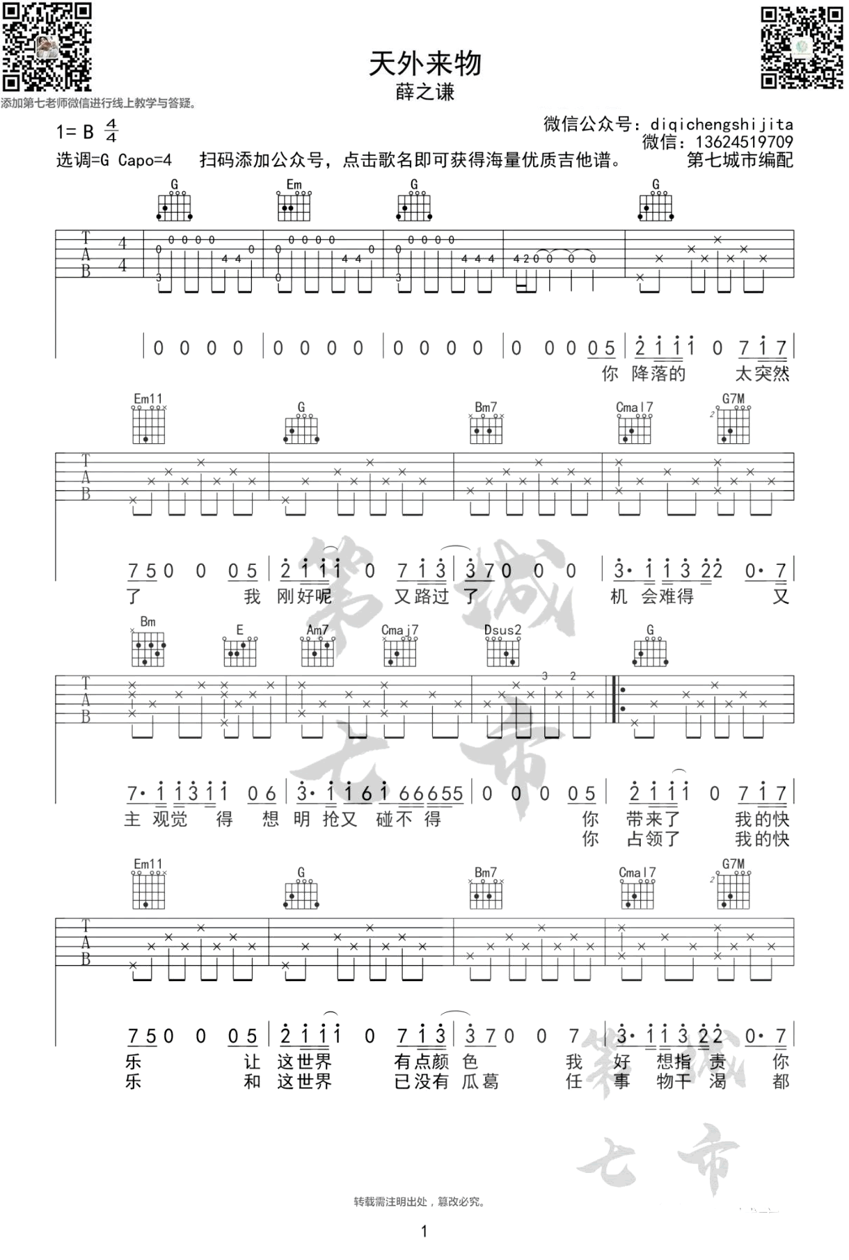 曲谱介绍: 天外来物,薛之谦演唱的一首新歌,原调B选调G,CAPO夹四品。天外来物六线谱,三张图片弹唱谱,感谢第七城市制谱分享,琴谱网网上传更新。 老薛在自己生日发的新歌,你像天外来物一样求之不得,你带来了我的快乐,依然是薛式情歌独有的深情~愿你别卷入世俗,我别沉迷初遇...…