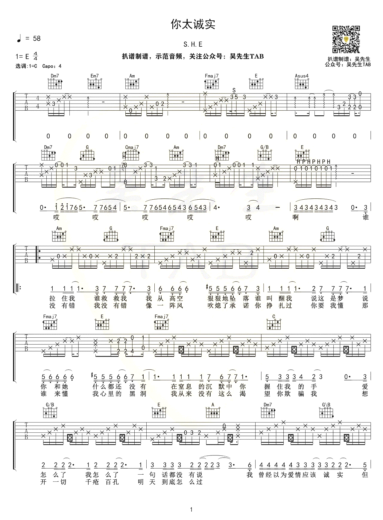 你太诚实吉他谱 - SHE - 吉他弹唱谱
