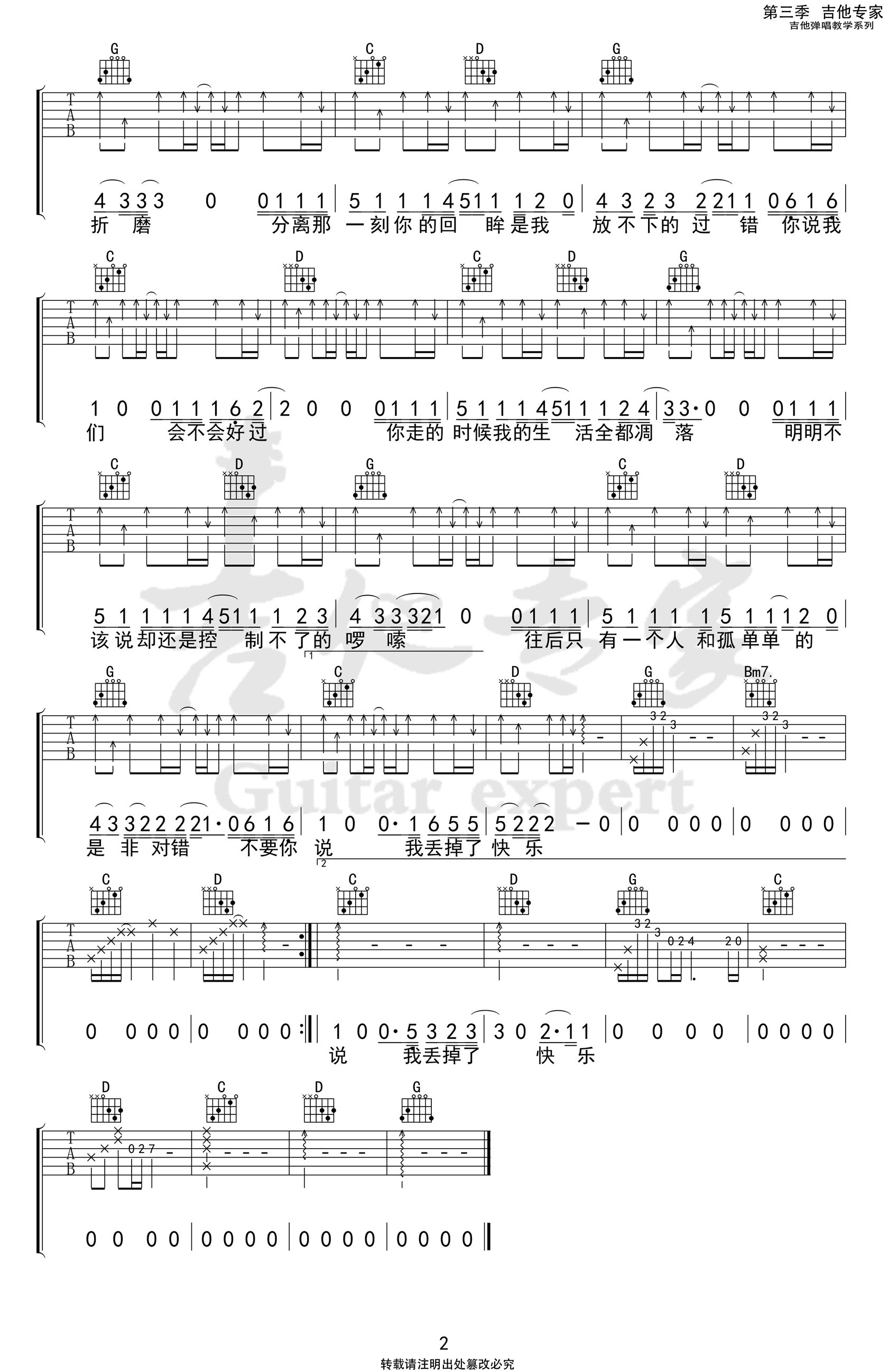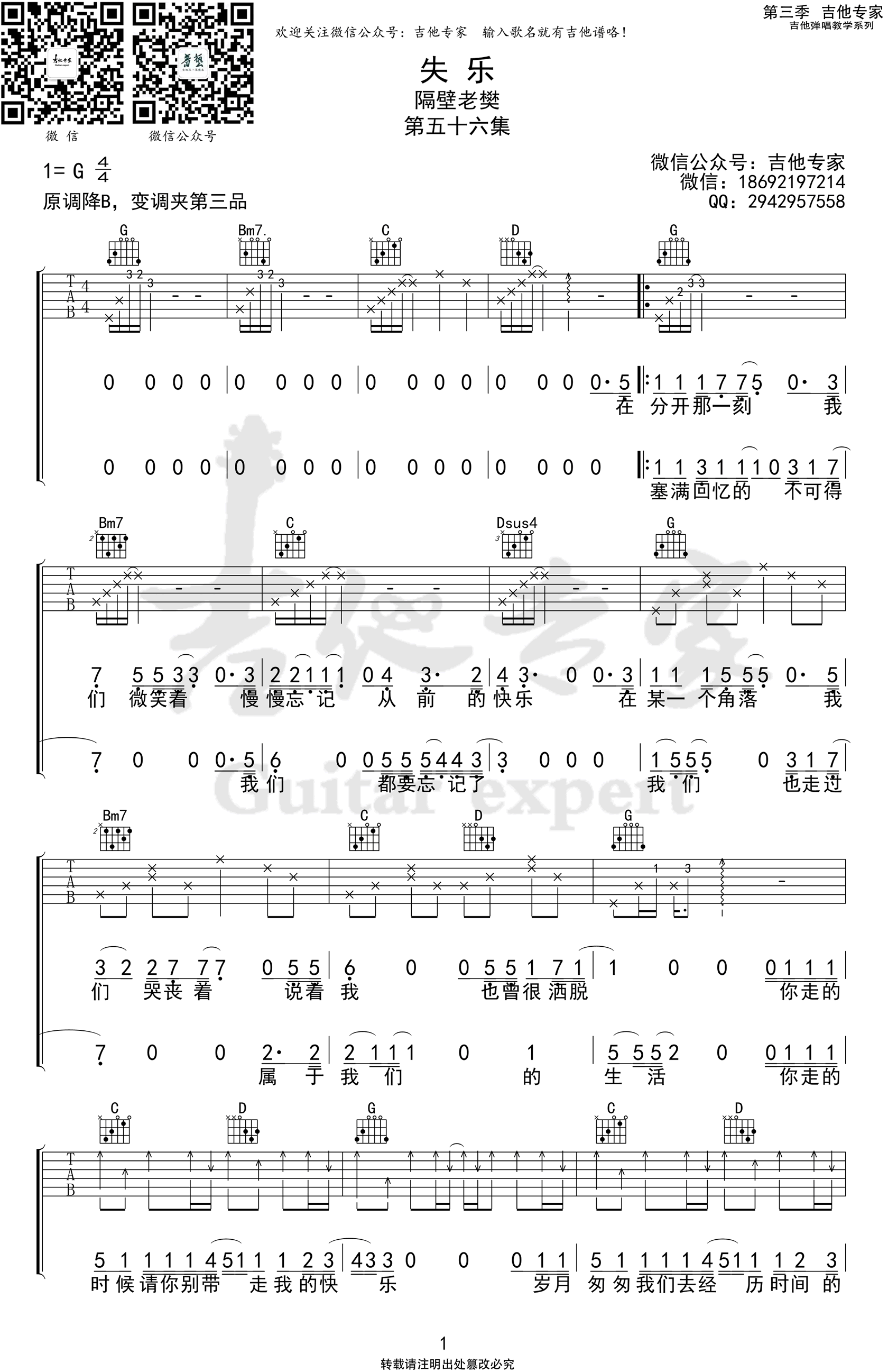 曲谱介绍: 隔壁老樊《失乐》吉他弹唱谱,共有2张高清图谱,免翻页排版设计。