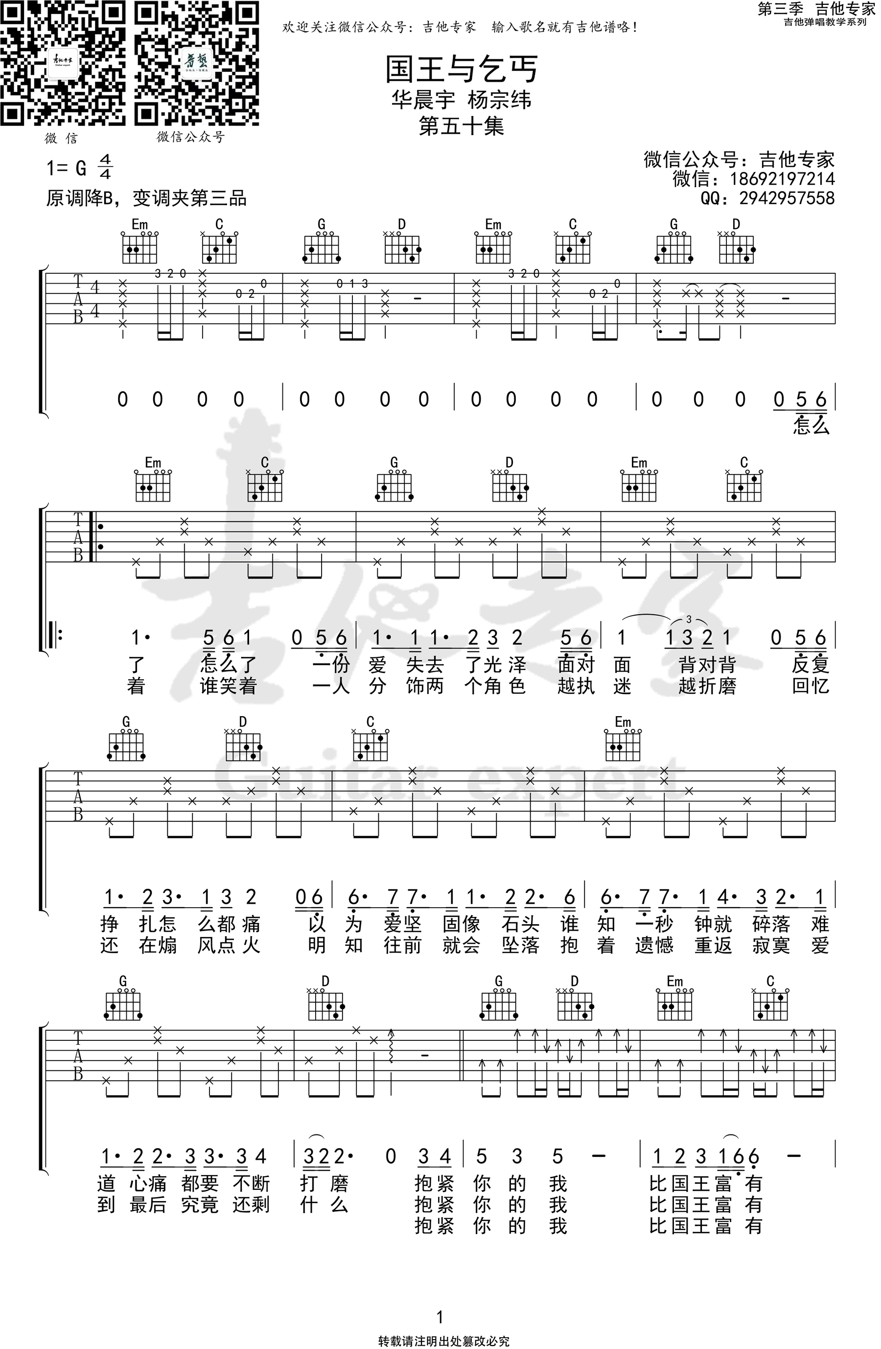 曲谱介绍: 华晨宇《国王与乞丐》吉他弹唱谱,共有3张高清图谱。