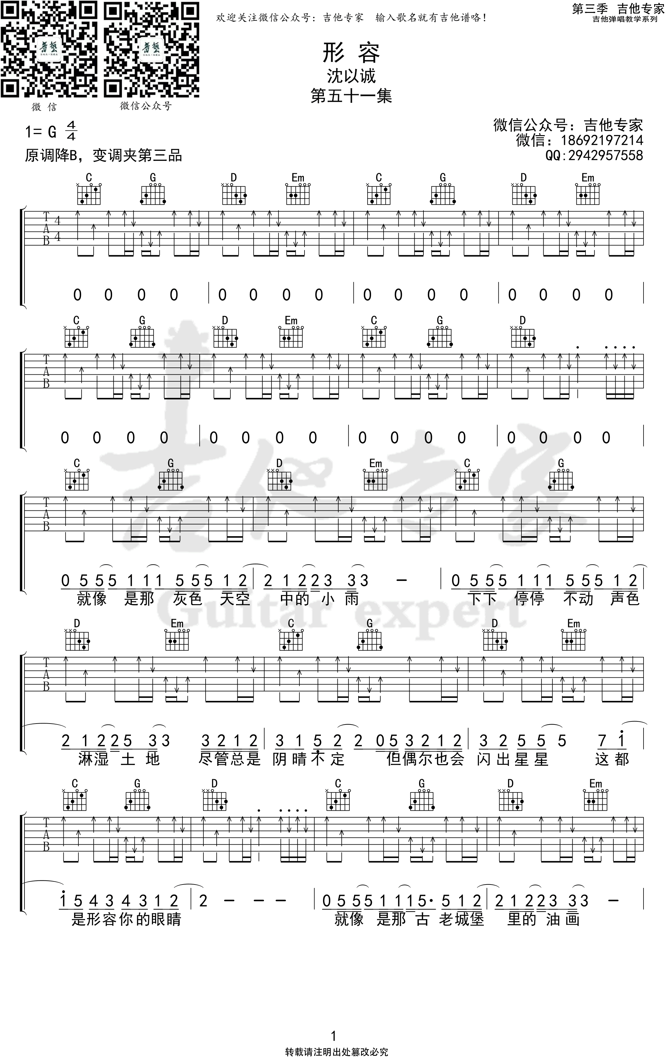曲谱介绍: 沈以诚《形容》吉他弹唱谱,共有4张高清图谱。