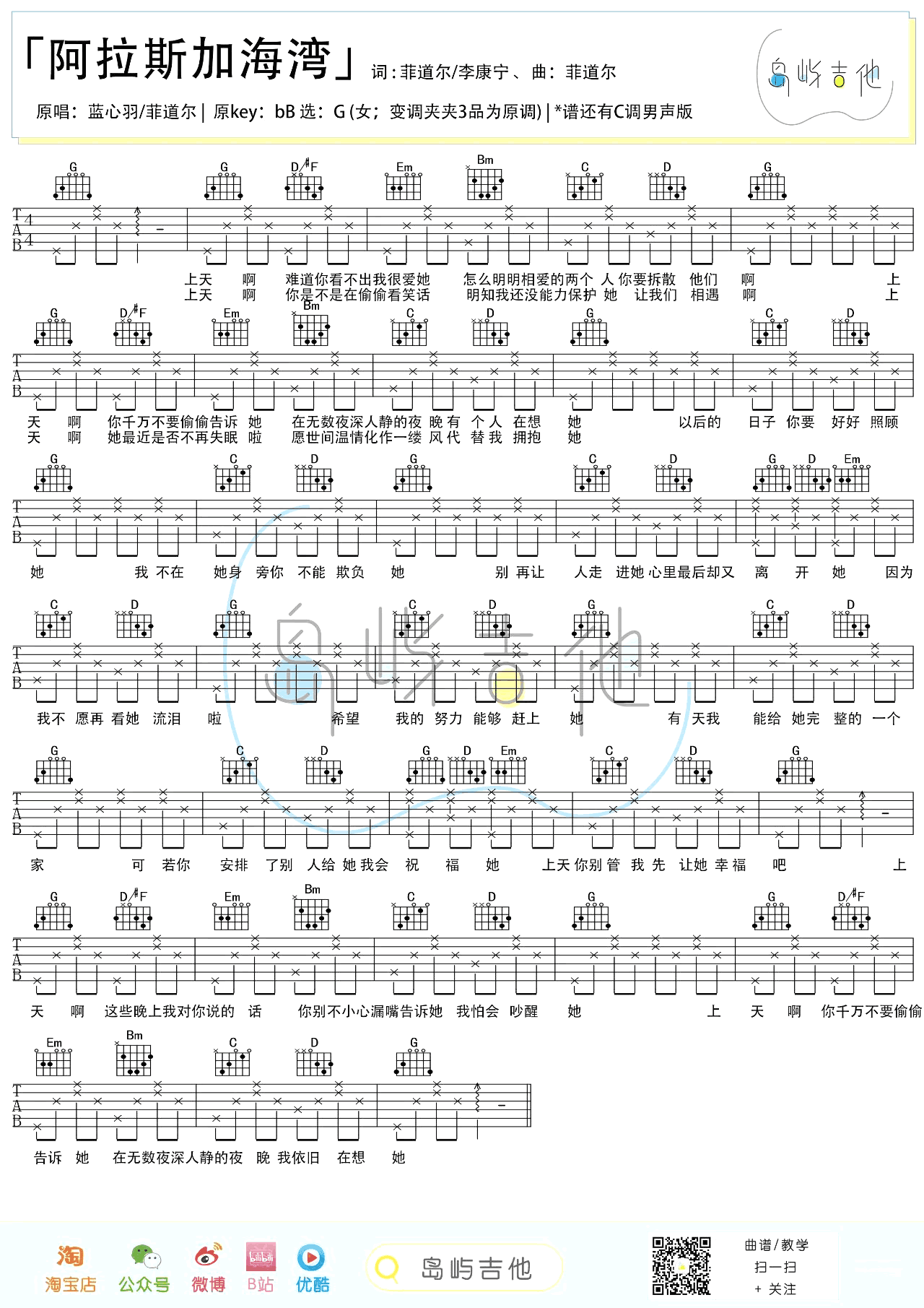 曲谱介绍: 蓝心羽《阿拉斯加海湾》吉他弹唱谱,共有2张高清图谱,免翻页排版设计。