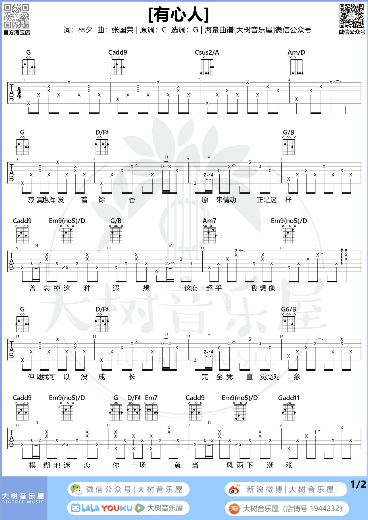 曲谱介绍: 张国荣《有心人》吉他弹唱谱,共有3张高清图谱。