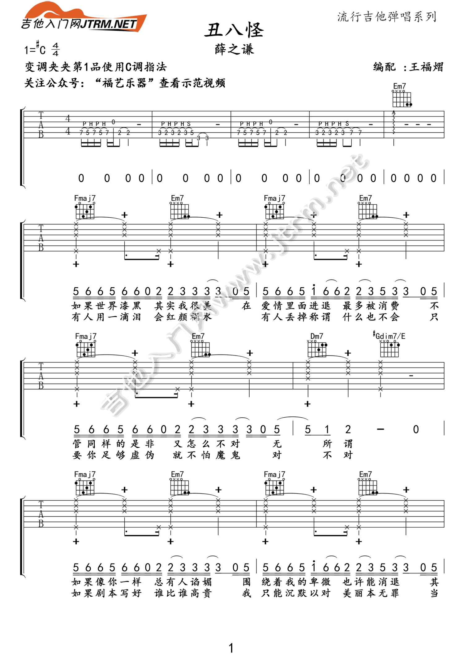 曲谱介绍: 丑八怪吉他谱,薛之谦演唱的一首歌曲,原调#CC,变调夹夹第一品,使用C调指法。丑八怪六线谱,为高清图片弹唱谱,喜欢这首歌曲的琴友们可以右键另存为打印收藏。