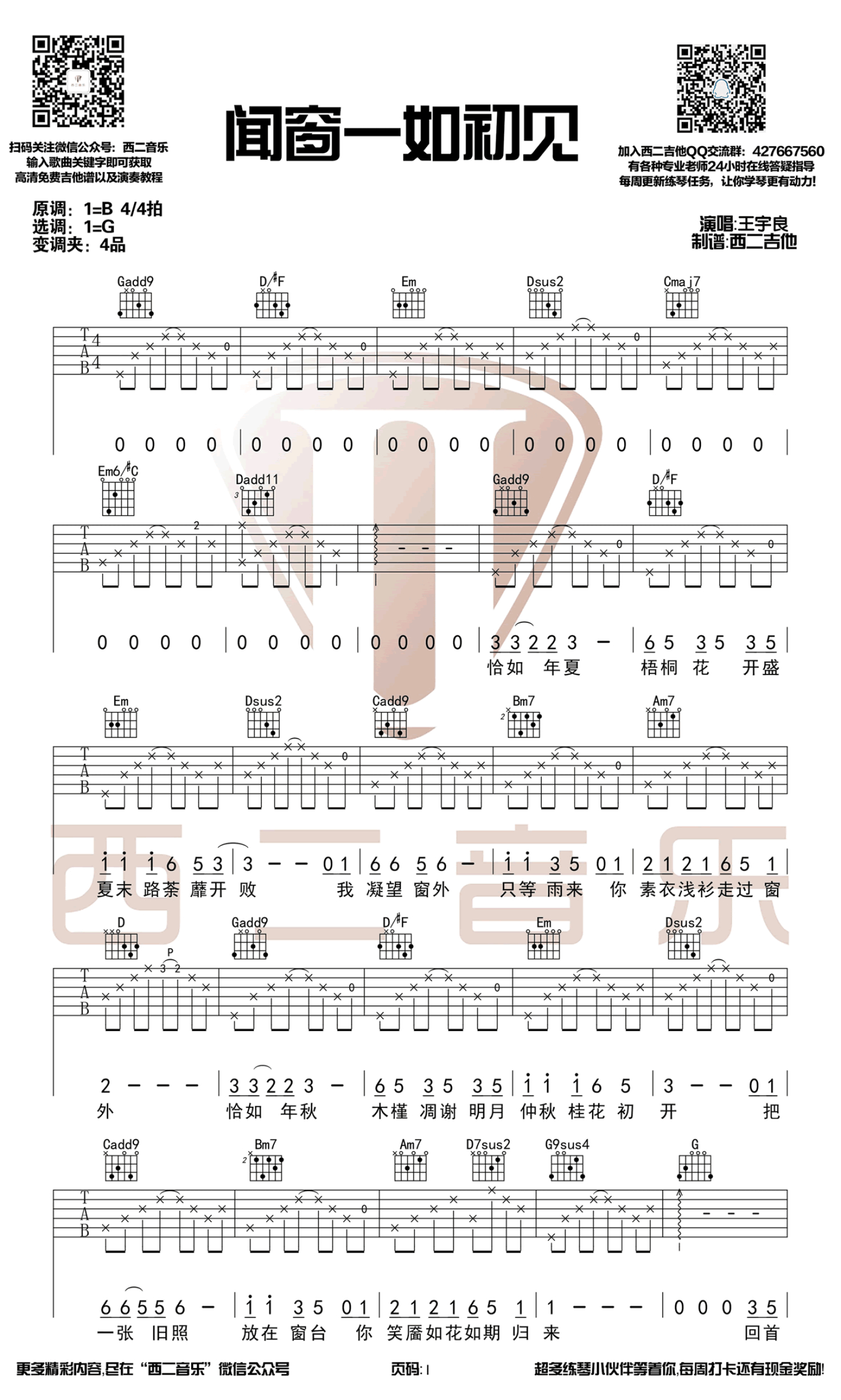 曲谱介绍: >闻窗一如初见吉他谱,陈可心作词,王宇良编曲演唱的的一首民谣创作,《闻窗一如初见》弹唱六线谱,原调B,选用G调,变调夹夹四品,这首歌虽称不上多惊艳,但有种平铺直叙的抒情达意,歌名也具有诗意,旋律很轻很慢,就像在和你诉说一个年少时的故事,带着一丝淡淡的忧伤。这样安静的唱上一曲,自有它迷人动人之处。
