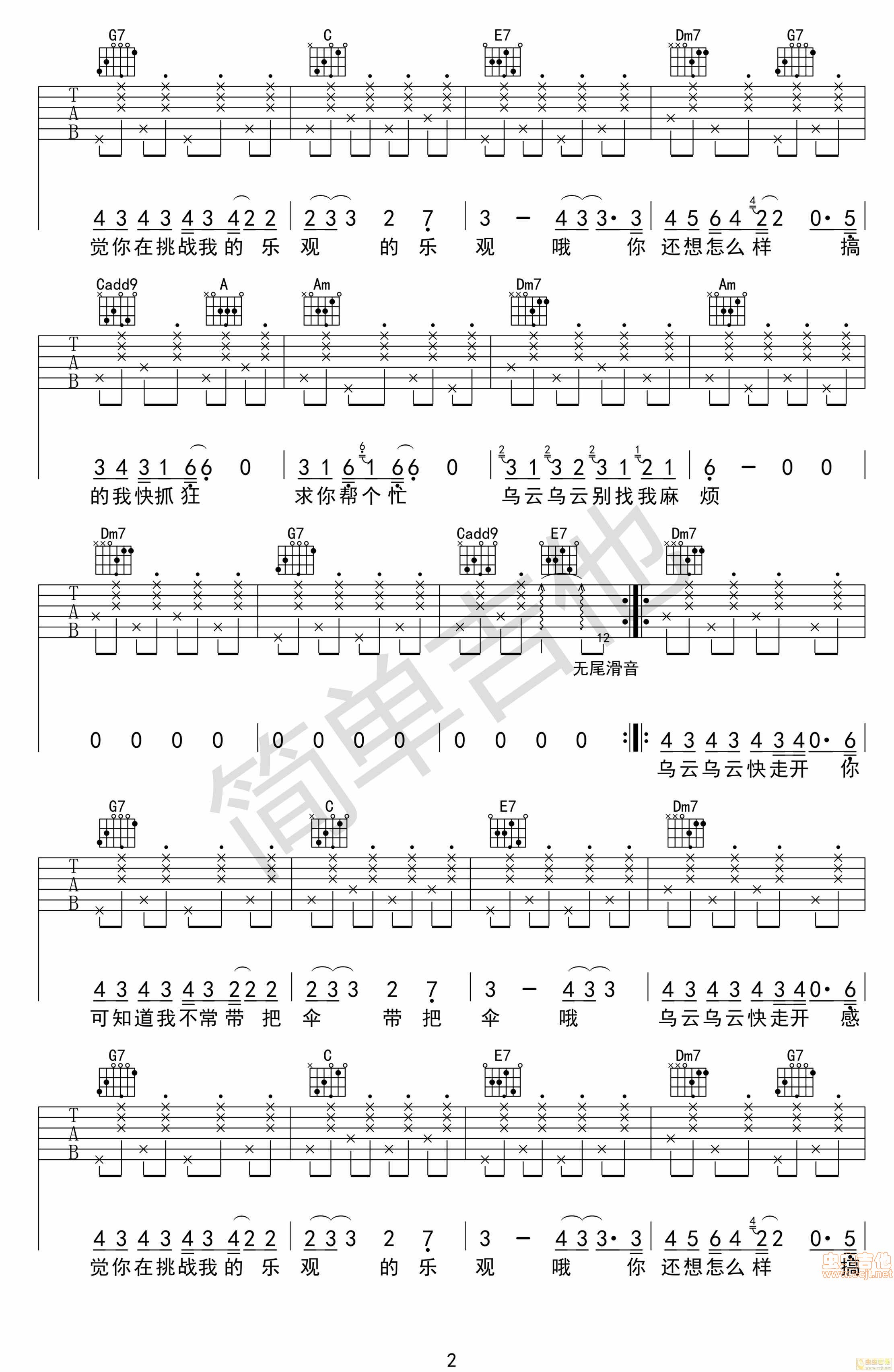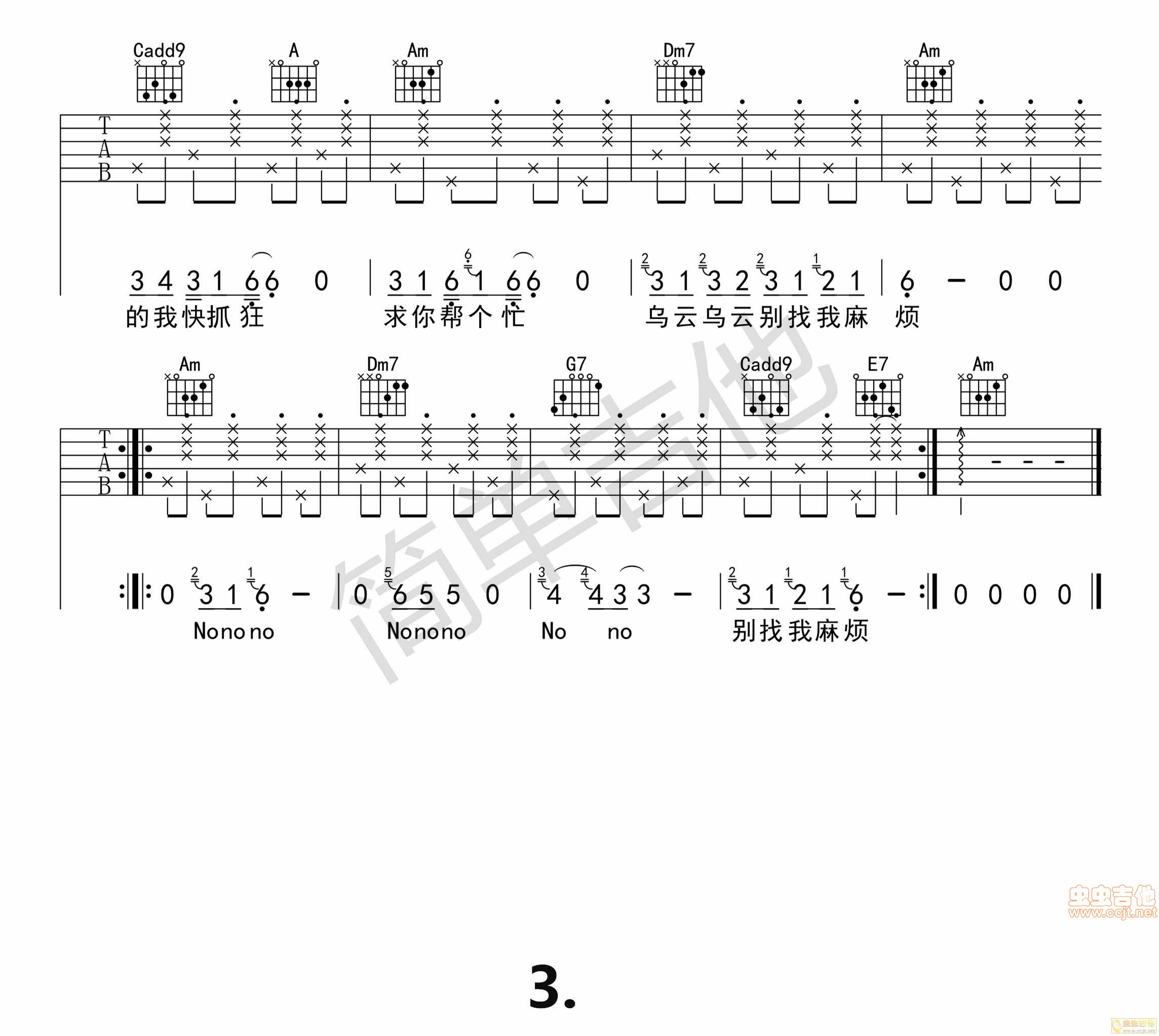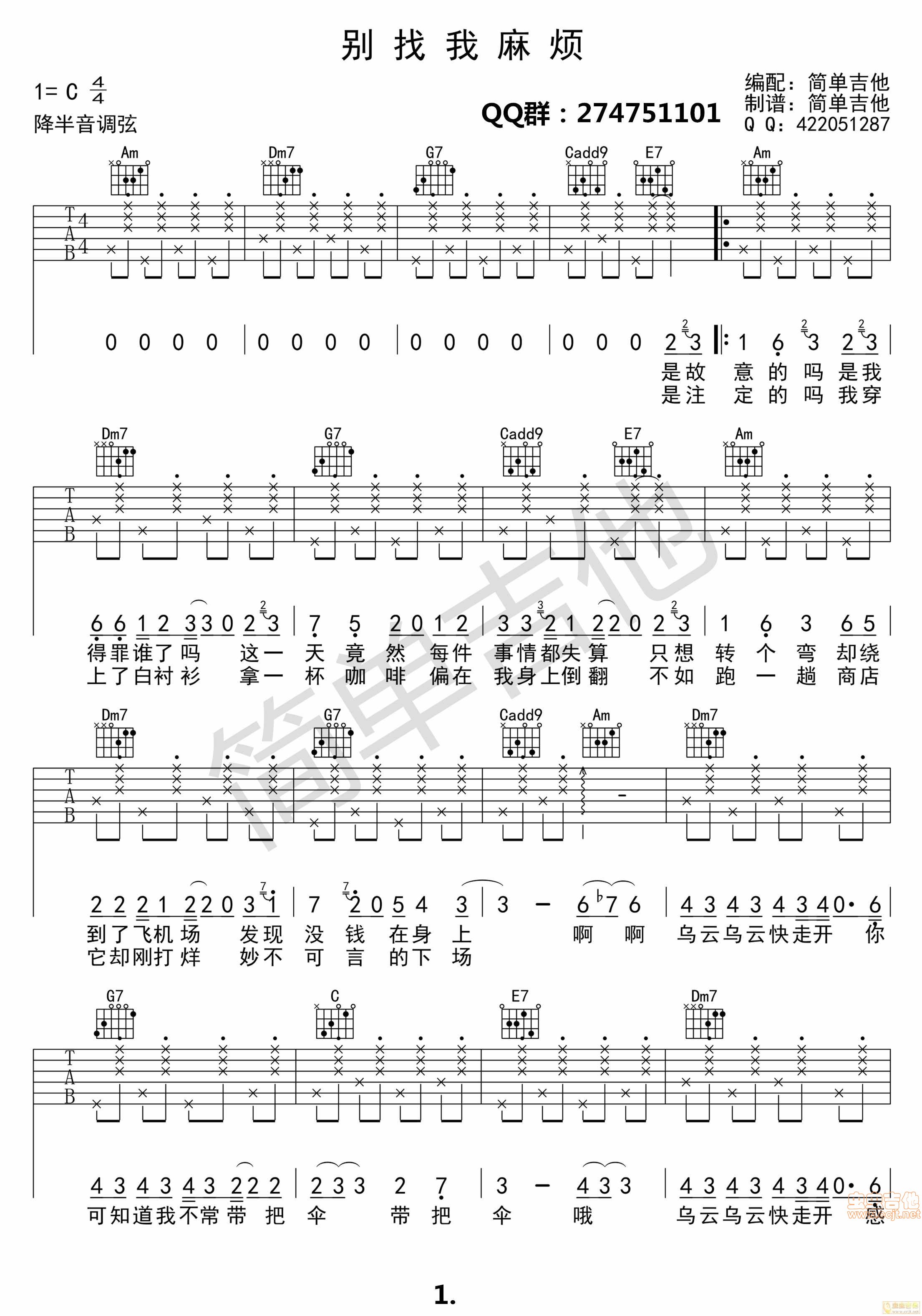 曲谱介绍: 《别找我麻烦》吉他弹唱谱,采用C调指法编配,共有3张高清图谱。