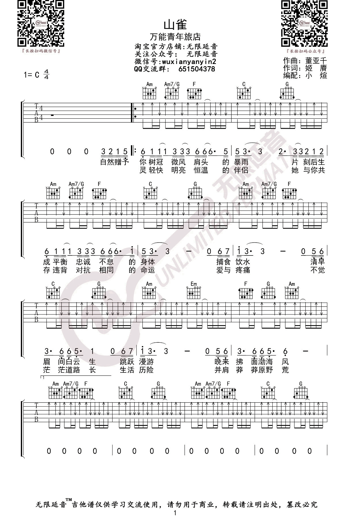 曲谱介绍: 万青旅店《山雀》吉他弹唱谱,共有3张高清图谱。